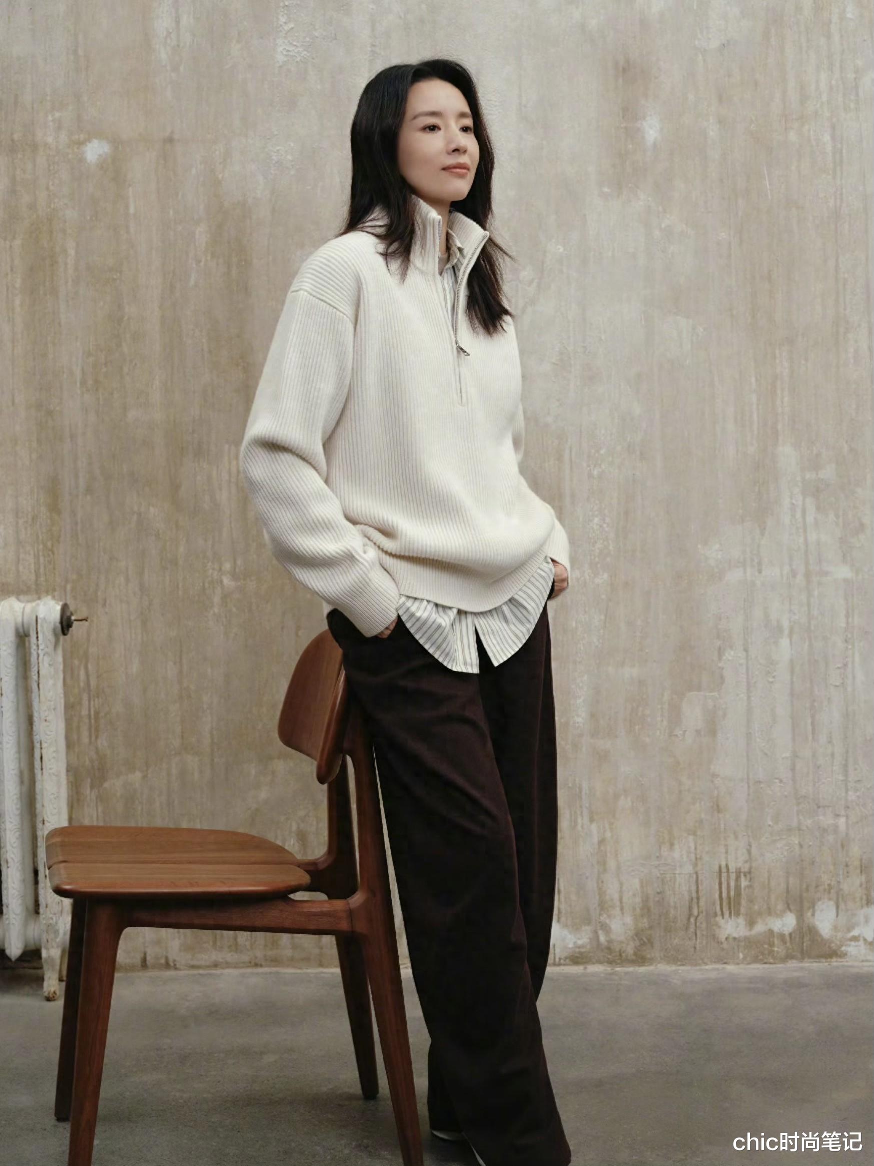 董洁自带白月光气质,穿搭更无须特意的装饰,一身简约的米色Polo立领毛衣内搭同色系米色条纹衬衫,超级休闲的一套look,配上棕色长裤,慵懒随意的穿搭拿捏住了。