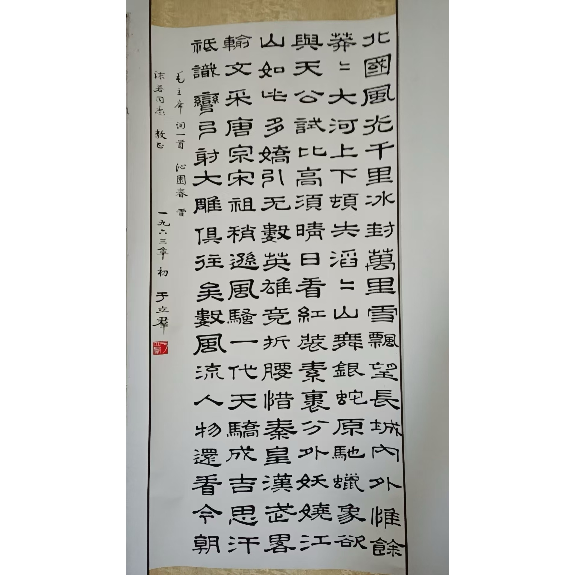 在书法艺术的璀璨星空中,于立群于 1963 年初创作的隶书《沁园春・雪》,无疑是一颗耀眼的星辰。这幅 4.41 平方的书法作品,不仅仅是笔墨的组合,更是时代精神、艺术造诣、文化传承与收藏潜力的集大成者。它如同一把钥匙,为我们打开了一扇通往多重价值世界的大门,每一个维度都散发着独特而迷人的光彩。