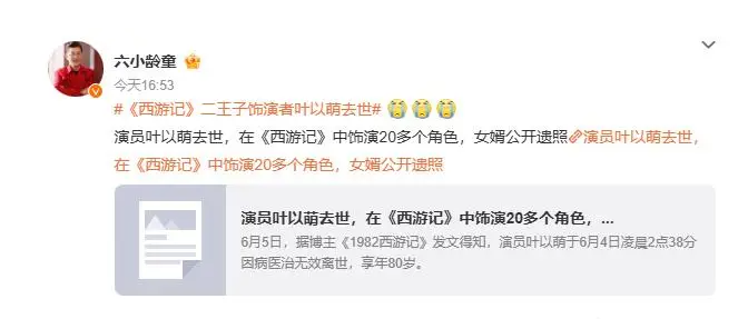 演艺圈近日再传噩耗,曾在 86 版《西游记》中有着精彩表现的演员叶以萌,于 6 月 4 日凌晨 2 点 38 分因病医治无效,永远地离开了我们,享年 80 岁。6 月 6 日,演员六小龄童在个人社交媒体转发相关消息,沉痛悼念老友,证实了叶以萌去世这一令人悲痛的消息。