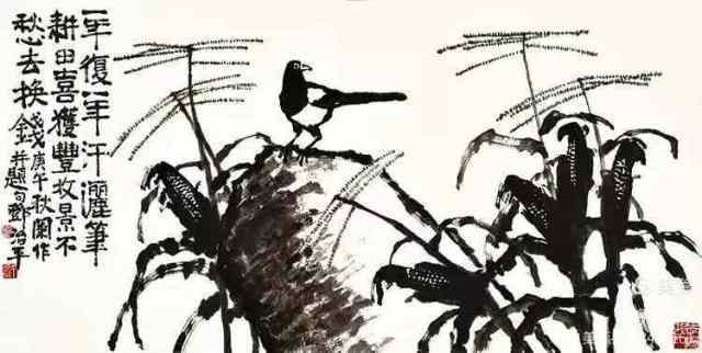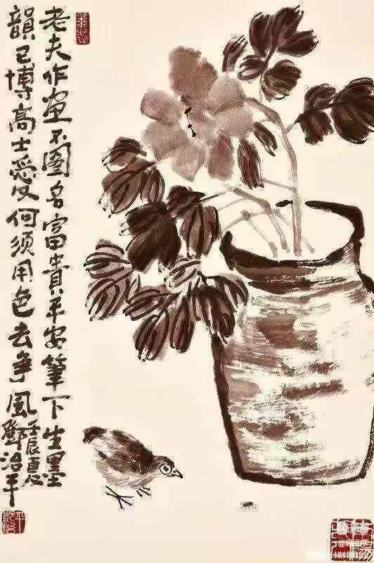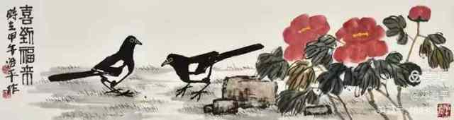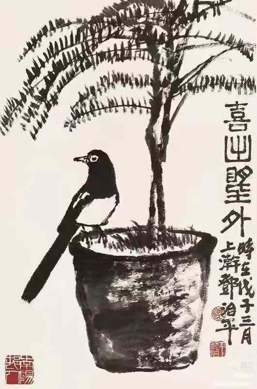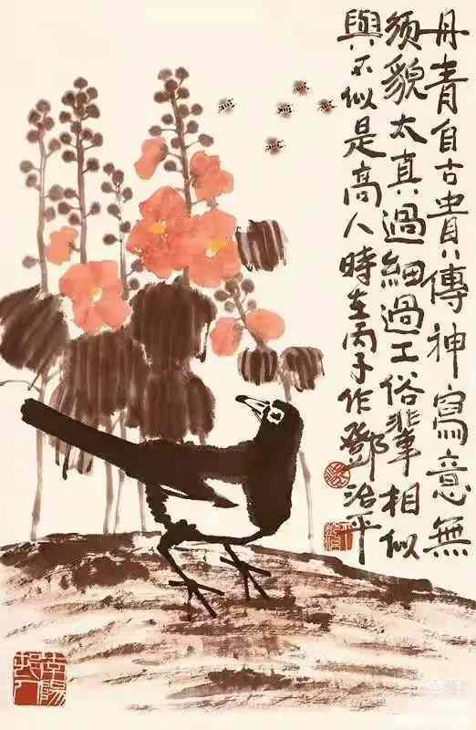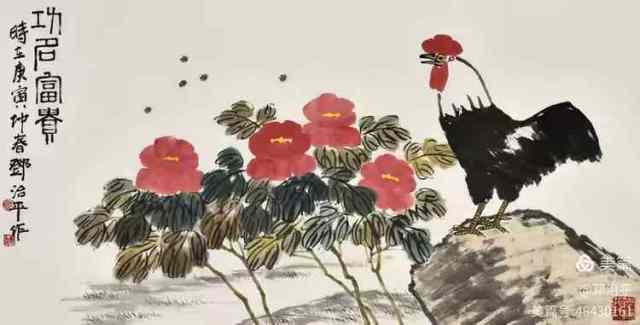 的确, 在邓治平的国画创作中,写意花鸟画逐渐占了越来越大的比重,在这个领域他倾注了更多的心血。当传统笔墨技法在古人和近人中已臻极致,那么,后来人路在何方?终于,他发现传统国画存在着巨大的色彩空间,这是古人在不经意间留下的。因古代文人画融入禅风道骨,最重笔墨情趣,追求的是天人合一的境界和淡泊宁静的精神寄托,因此在色彩上尽量淡化、虚化,与民俗画风中的浓墨重彩恰成鲜明对比, 倘将两者结合起来,再借鉴西洋美术的色彩理念,那么,这样的国画作品既植根传统,亦将更富于时代特征,也将为更多的海内外公众所喜爱、所认同。2000年5月,邓治平在题《牡丹》的诗中写道:“ 青藤雪个画坛杰,路过白石似断绝。要谢老天独爱我,偷施浓彩补前缺。”于是,他的系列写意花鸟画作品以其鲜活明丽、率性天然和强烈的视觉冲击力崛起于中国画坛,受到媒体和公众关注,并大步走向海外。