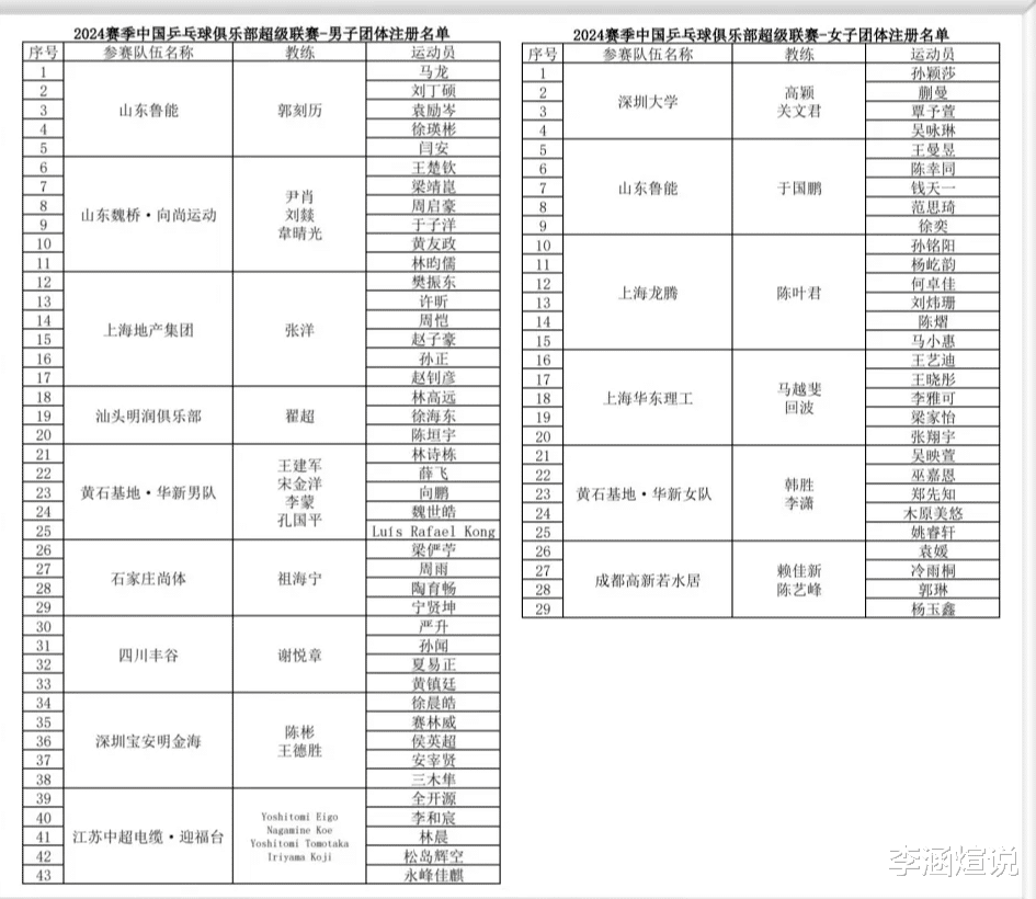 截止到12月10日消息,本次乒超联赛的参赛名单已经正式出炉。