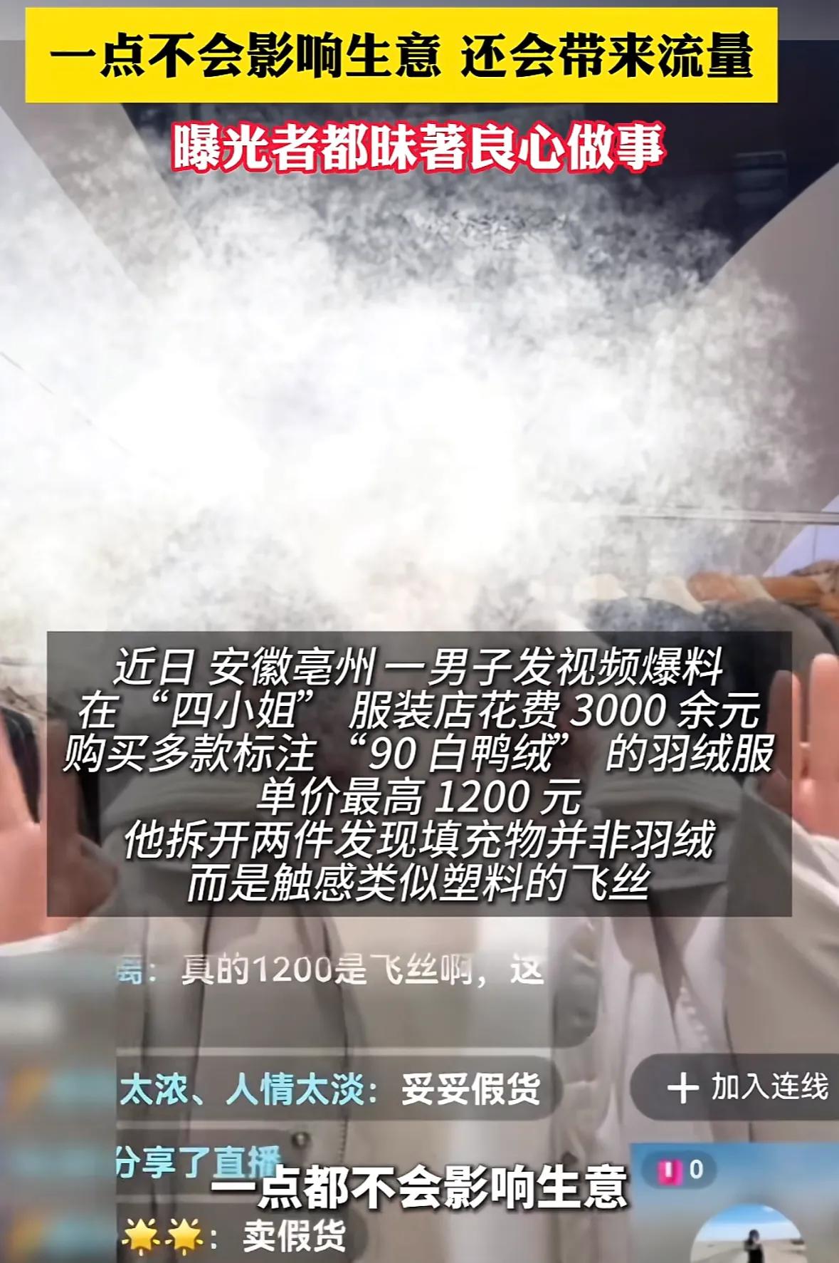 据当地网友介绍,四小姐店在亳州也算是很有名的了,在网上也有账号,算是网红店。因为她们的价格比较高,所以顾客大多数是本地得小富婆,她们应该也没想到自己花大价钱买来的羽绒服竟是飞丝吧?