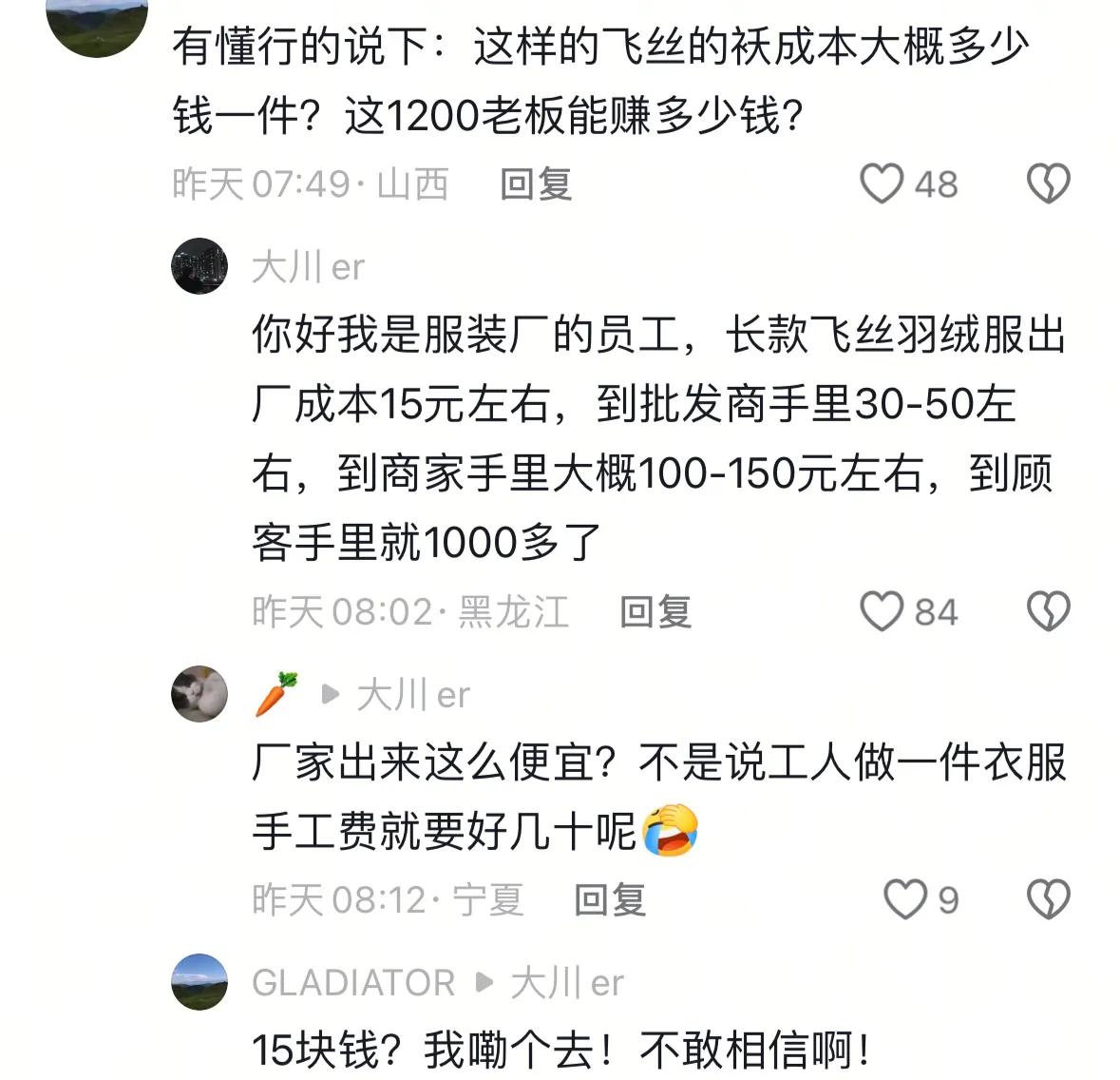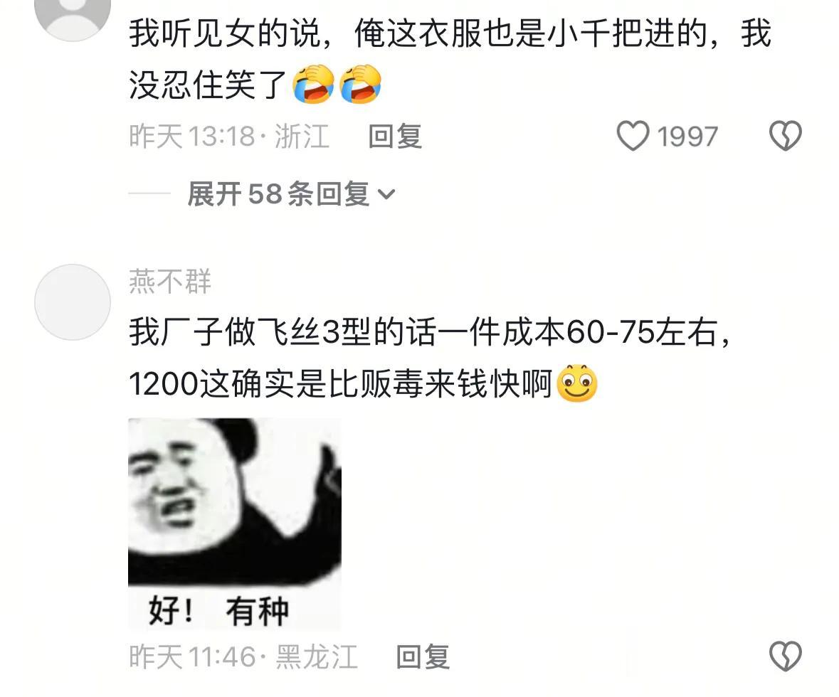 网友说这简直是暴利啊!一件飞丝成本也就几十块,她们竟然卖到上千,利润都是百倍啊!怪不得她们死不承认,要是认了还怎么骗人呢?老板自己穿奢侈品,让亲爱的们穿飞丝,太讽刺了!