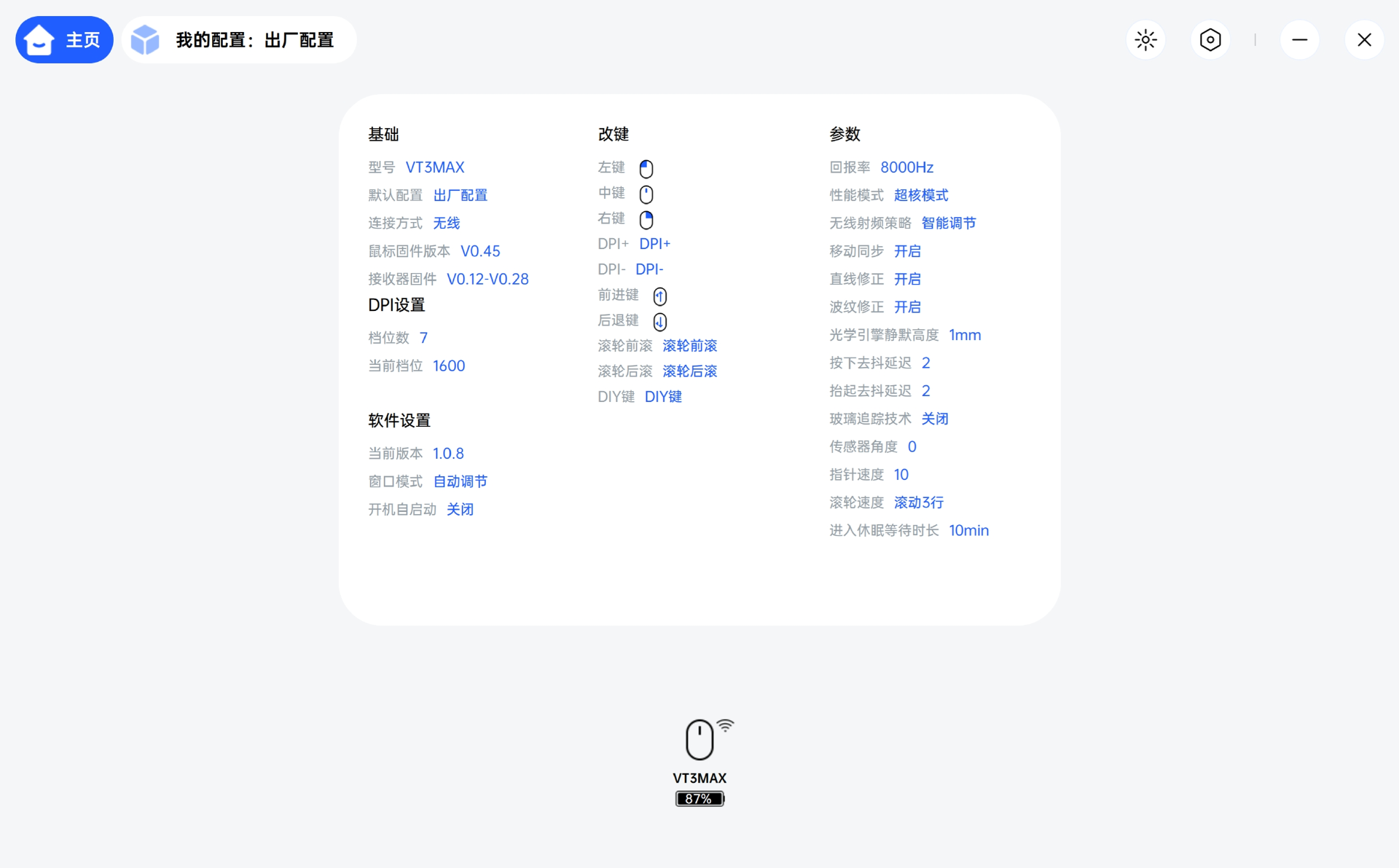 在我的配置里可以看到众多内容,比如型号固件版本、DPI档位及数值以及回报率和性能模式等等,一目了然。