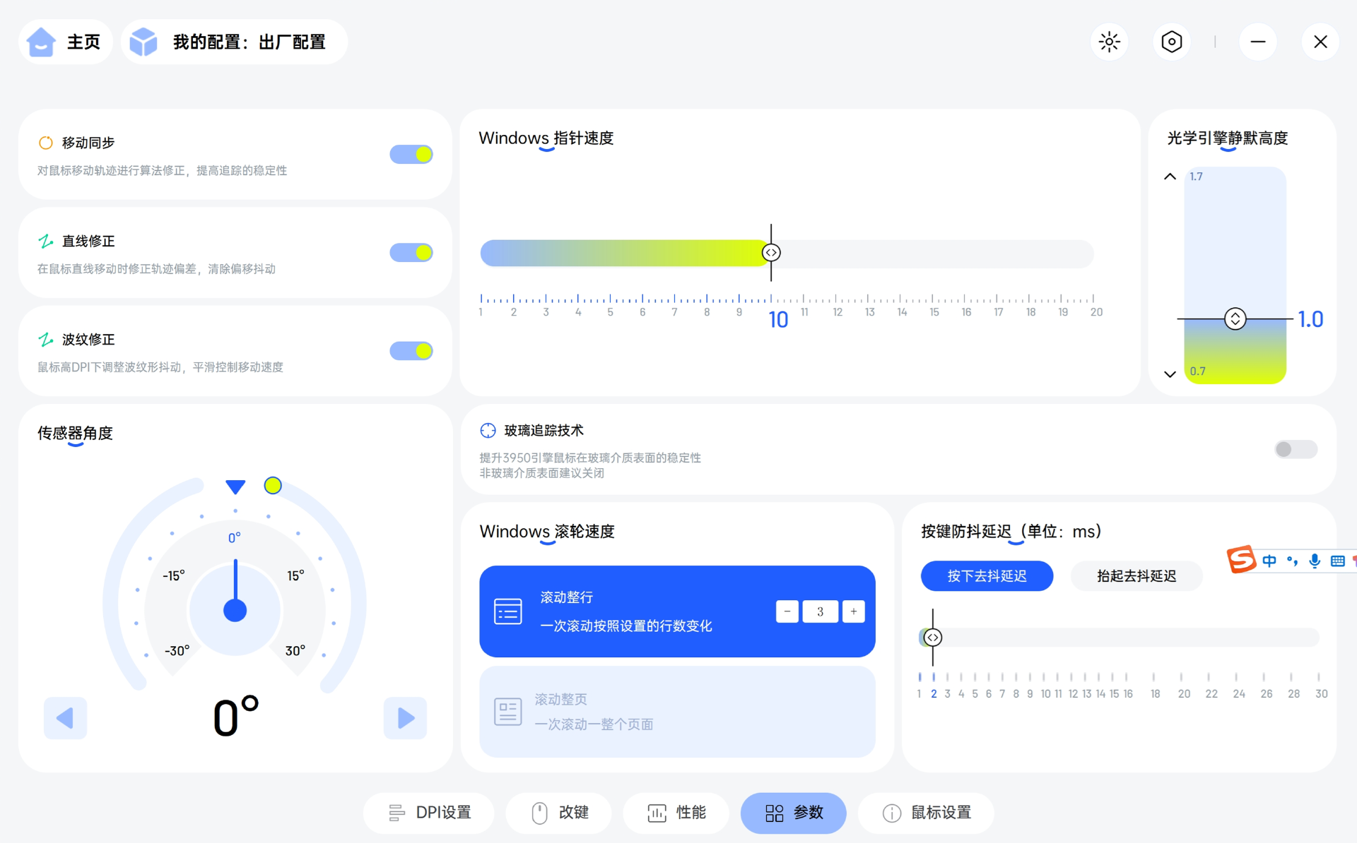 参数方面设置,像修正类的直接开,Windows指针速度和Windows里调节大致相同,需要注意的是光学引擎静默高度,这个选项可以适当上调,当你鼠标回撤的时候,轻抬鼠标,只要在静默高度范围内就不会出现失帧的情况。
