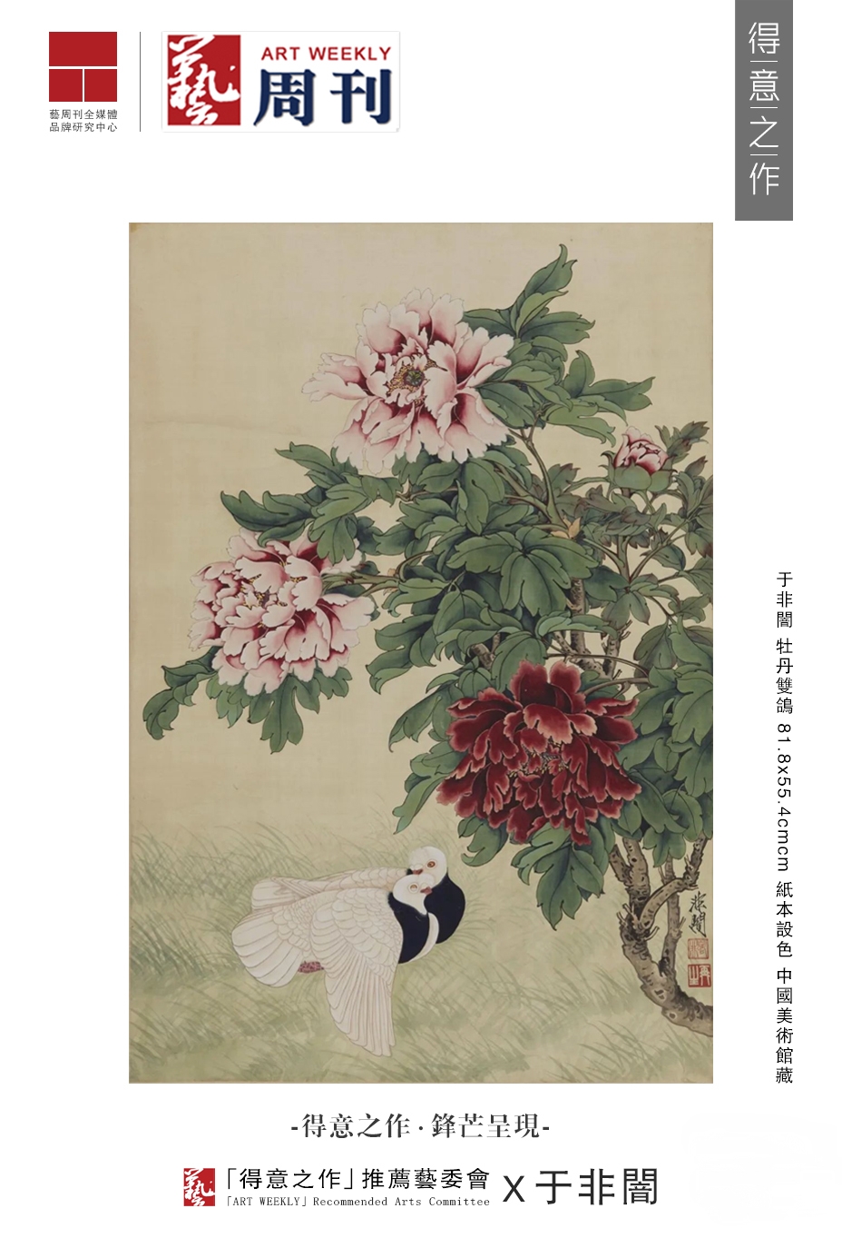 于非闇的得意之作《牡丹双鸽》,创作于50年代,现藏于中国美术馆。这幅画是不仅仅是一幅花鸟画,更是一座融汇了宋代院体精神、唐代装饰色彩、以及现代写生观察的艺术丰碑。作为“于派”工笔的典范之作,其创新性的色彩配置与构图理念对现代工笔花鸟画产生了重要影响。
