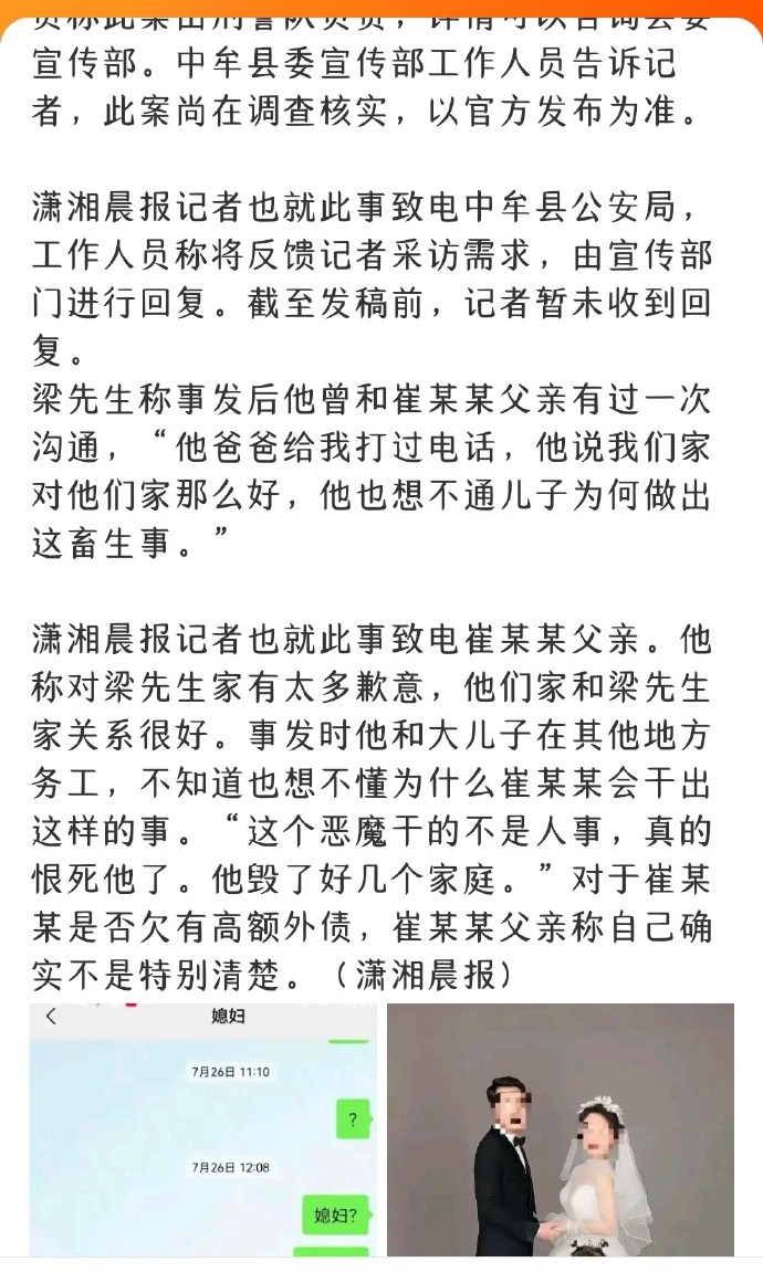 然而,7月26日,这份持续二十多年的情谊被彻底撕裂。在外务工的梁先生因联系不上妻儿,委托崔某某前去查看。这个最该伸出援手的人,却成了制造悲剧的元凶。