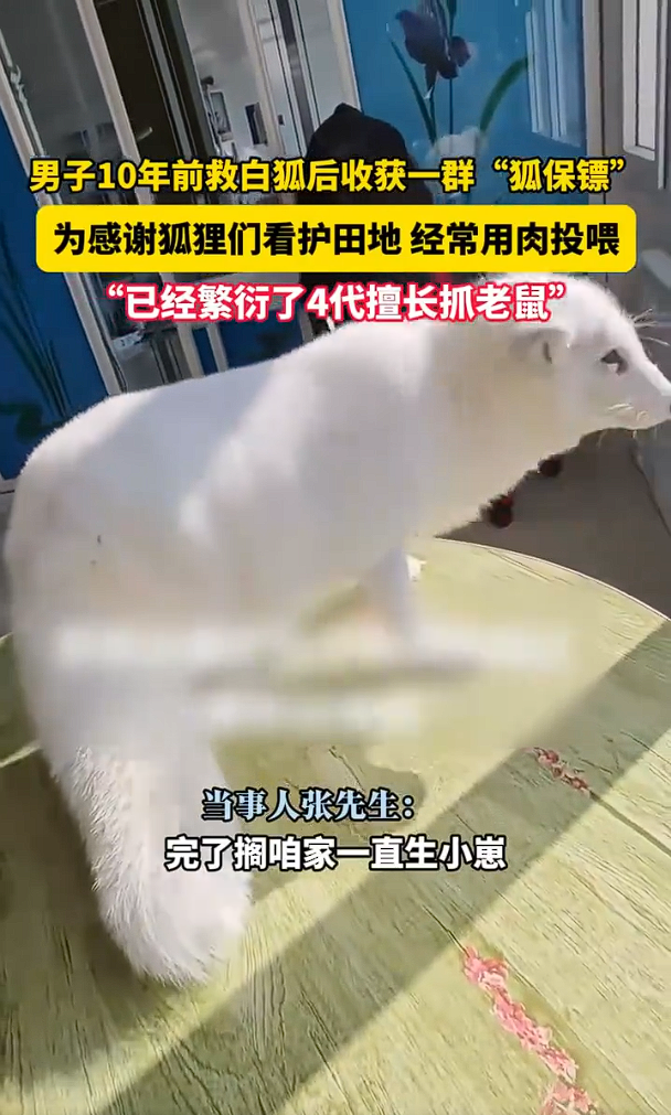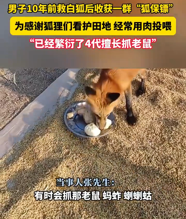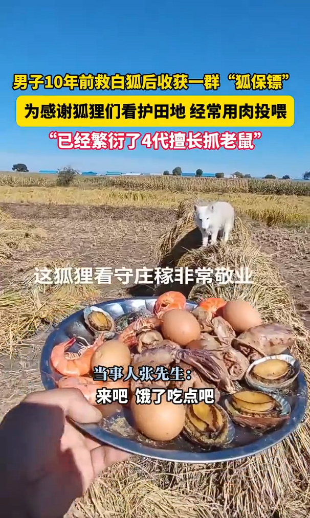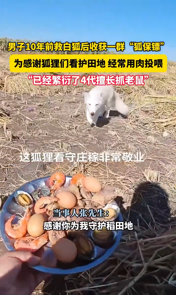 四年后,一只白狐重伤复发,张先生将其安置在自家田地旁照料。痊愈后的白狐不仅留下安家,更引来伴侣繁衍后代。令人惊喜的是,这些狐狸自发承担起守护庄稼的职责:它们敏捷穿梭于田埂,捕捉啃食稻谷的老鼠与害虫。因狐狸的“勤勉工作”,张先生家的稻田多年免受鼠患侵扰,产量显著提升。为表感谢,他每日准备鸡架、狗粮甚至螃蟹等“豪华加餐”,而狐狸群闻其呼唤便蜂拥而至,俨然一支训练有素的护卫队。