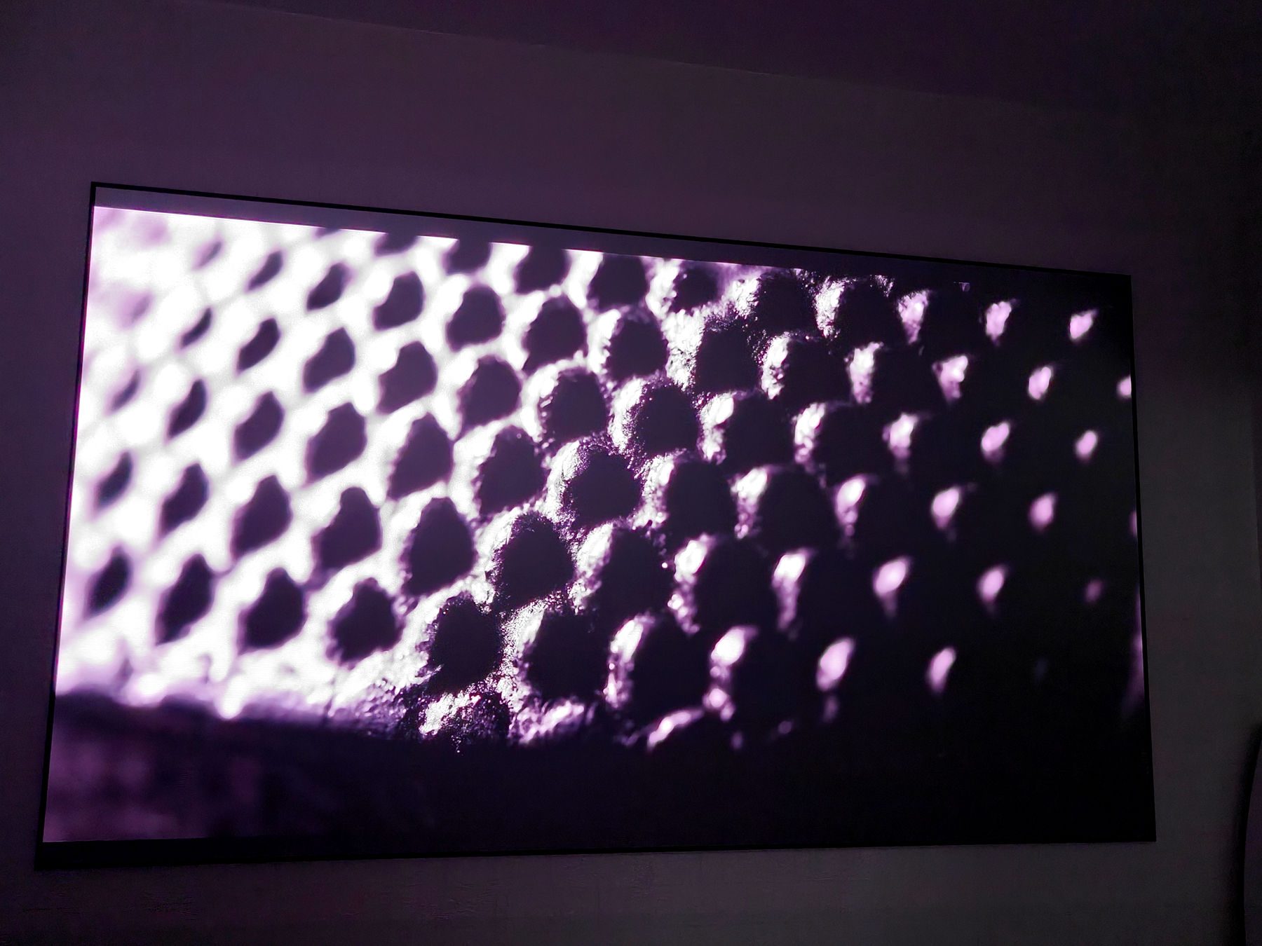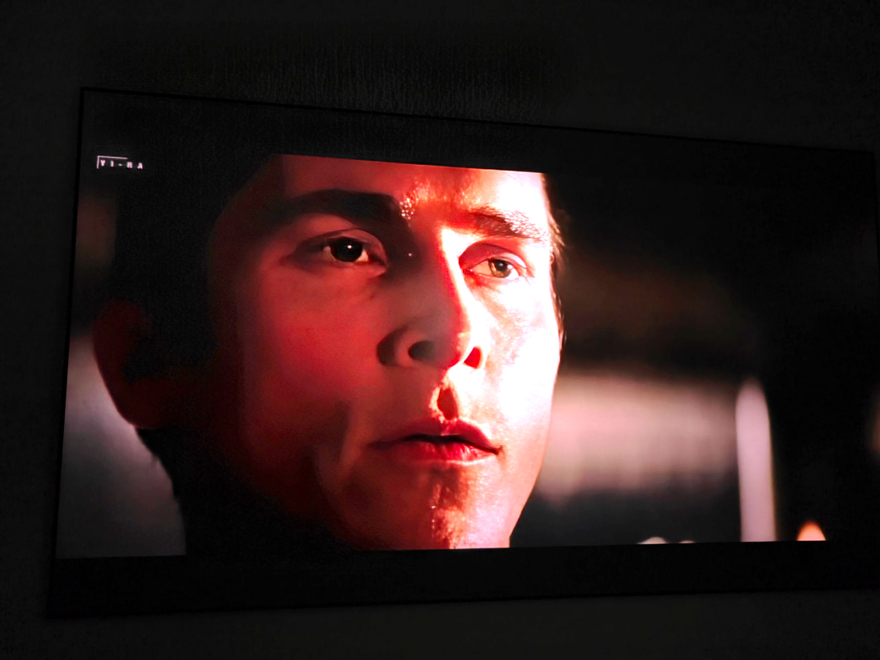 实际投影效果,我们把投影投到我之前就已经买好的100英寸光学幕布上,先从开灯投影的实拍图来看,可以看到当贝S7 Ultra Pro投影仪的真实亮度表现非常出色,清晰度和亮度都很高,仔细来看,整体画面里的人物的细节、包括色彩,尤其是在一些大片里的昏暗的场景下,影片里的阴影部分都可以清晰的展现出来了,在白天开灯增亮的场景下,得益于,投影高达5300CVIA的超高亮度,投影的画面一点不输电视的画面,白天完全可以看投影了。这个亮度表现,核心原因是因为当贝的「影院级偏振合光技术」,不同于传统 DLP 投影的「光效浪费」,它能将激光光源的利用率提升到 10%,这也是为什么 5300CVIA 亮度的实际观感,相对于某些品牌标注的 5000 ANSI 亮度亮很多。