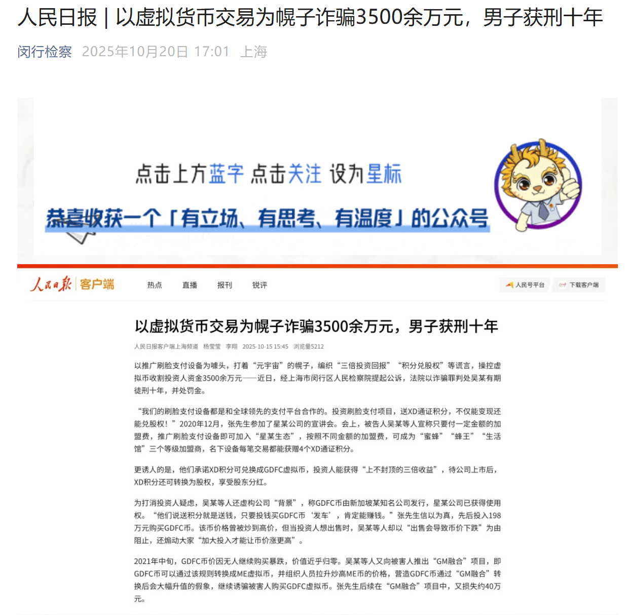 空气币的核心特征是"无锚定、纯炒作",闵行区吴某诈骗案极具代表性。2020年12月,吴某以"刷脸支付设备推广"为噱头,虚构"XD积分兑GDFC虚拟币可获三倍收益"的谎言,宣称该币由新加坡知名公司发行,未来可转为上市公司股权。为增强可信度,其还编造"元宇宙生态"等概念,吸引投资者入局。事实上,GDFC币是完全无实际价值的空气币,所谓"新加坡授权"纯属虚构。当2021年GDFC币价格暴跌归零后,吴某又推出"ME虚拟币"继续炒作,直至资金链断裂。经审计,该案涉案金额达3500余万元,吴某最终以诈骗罪获刑十年 。(点击↓下图查看全文)