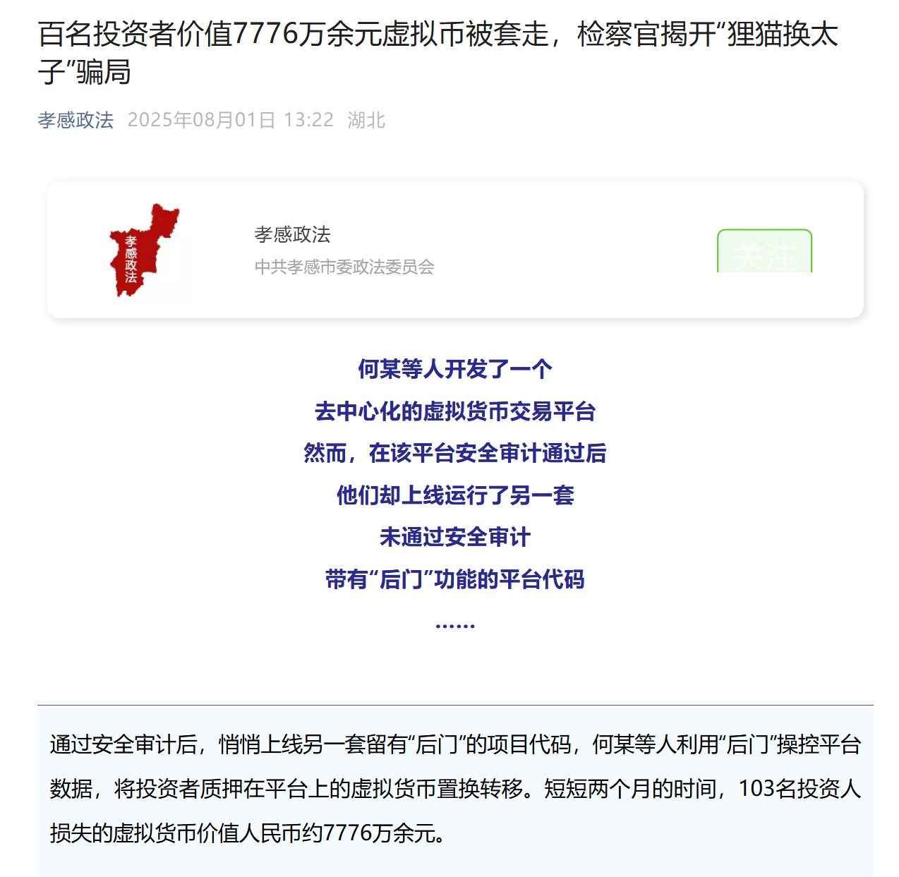 2020年7月,何某团伙开发去中心化虚拟货币交易平台,为获取投资者信任,特意聘请专业机构进行安全审计并公示报告。但审计通过后,他们暗中上线了留有"后门"的平台代码,该代码可任意修改"D币"价格,并能不经用户同意完成资产置换 。在李某等人的虚假宣传下,103名投资者陆续投入价值不菲的虚拟货币。当年10月至11月,团伙在凌晨操控"D币"价格暴涨数十倍,用自有"D币"置换用户资产并转移至私人账户,随后将"D币"价格压至几厘钱,导致投资者损失共计7776万余元。直至被害人发现资产被置换、平台负责人失联,这场精心设计的骗局才浮出水面。(点击↓下图查看全文)