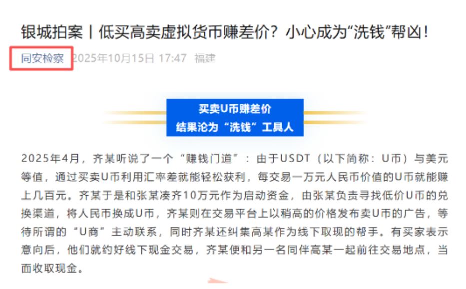 2025年4月,齐某听闻"买卖U币赚差价"的门路,明知交易资金可能涉及违法犯罪,仍与张某、高某组建团队:张某寻找低价U币渠道,齐某发布售卖广告,高某负责线下取现,每交易万元可获利数百元。他们实则充当了诈骗团伙的"线下承兑商",在被害人与骗子之间搭建资金桥梁——当被害人按骗子指引兑换U币时,齐某等人当面收取现金并将U币转入骗子控制的账户,三个月内便转移三笔诈骗赃款共计28.5万元。最终三人因掩饰、隐瞒犯罪所得罪获刑。(点击↓下图查看全文)