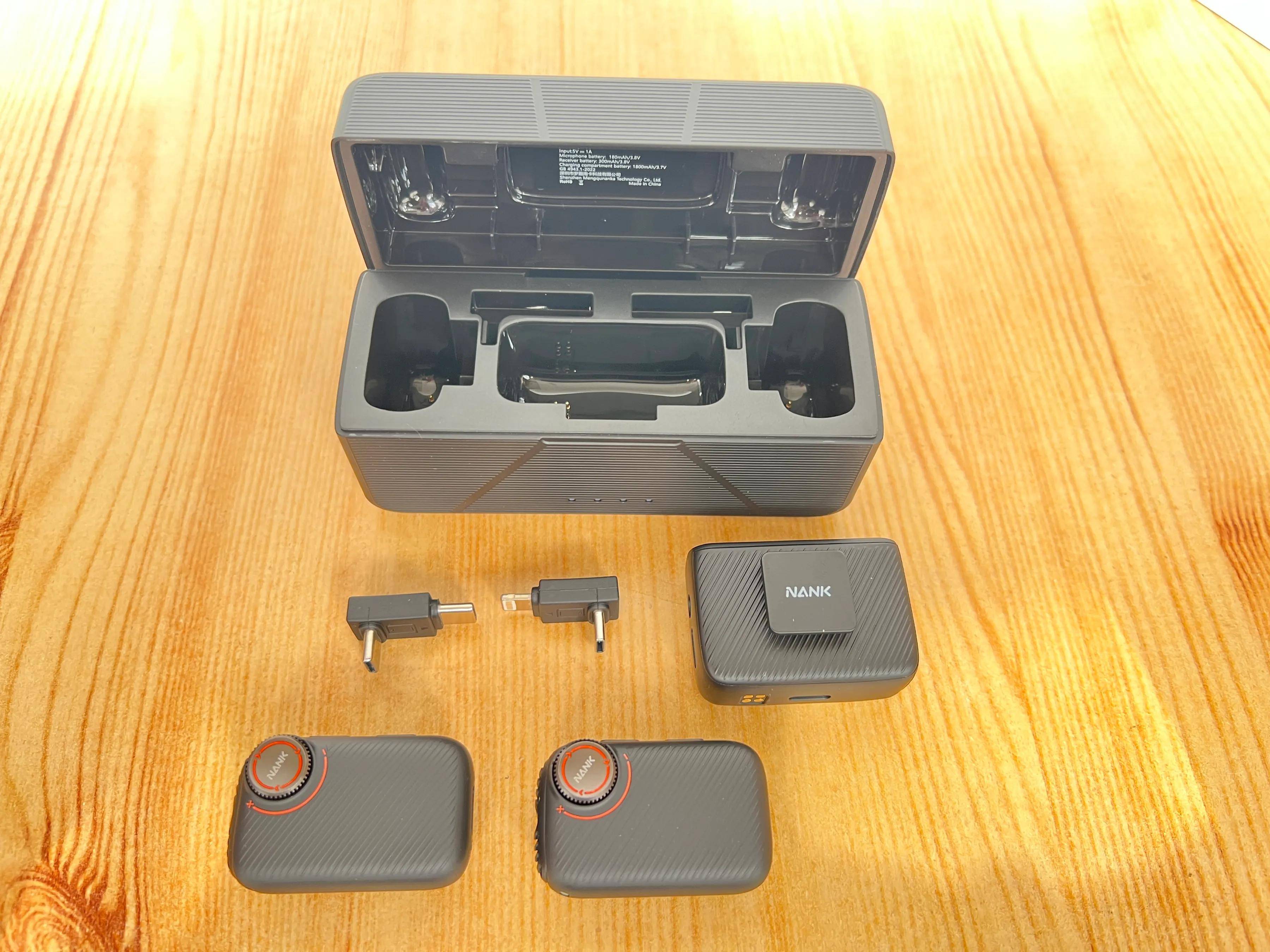 南卡Qmic麦克风的主体是一个收纳盒,也是充电仓,平时充电仓可为接收器和两只麦克风充电。充电仓内含两个麦克风、一个接收器,还附有Lightning转Type-C转接头和双Type-C转接头。两只麦克风各内置的电池容量为180mAh、接收器为300mAh、充电仓为1800mAh,充电仓可以当作充电宝,为手机等设备充电。南卡Qmic的综合续航达24小时,Type-C接口与手机充电线通用,不用带额外的充电器,出门拍摄时完全不用担心电量问题。