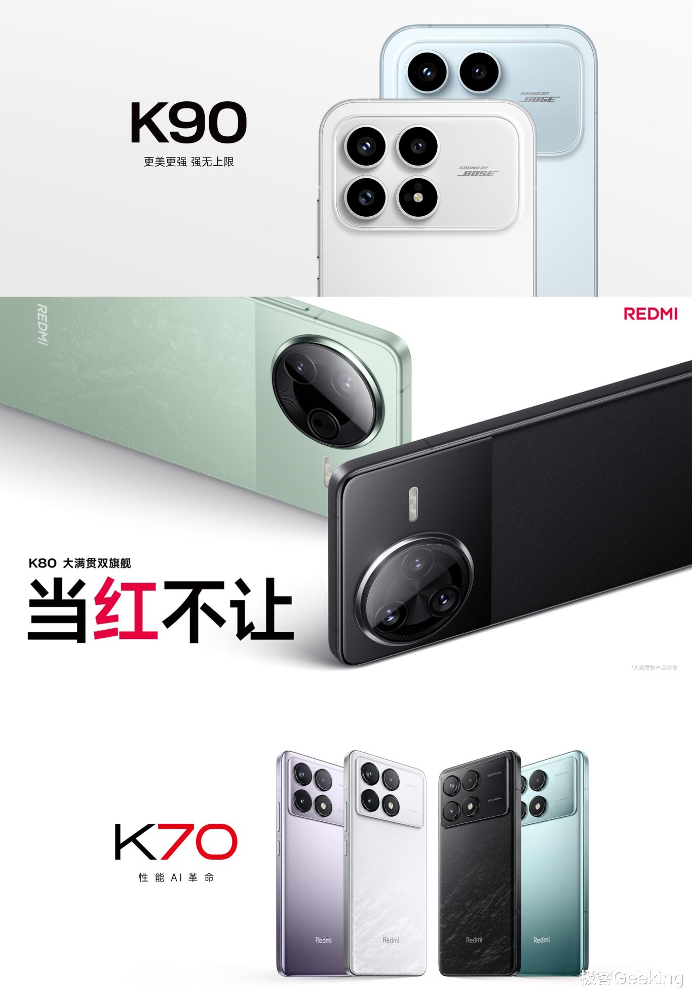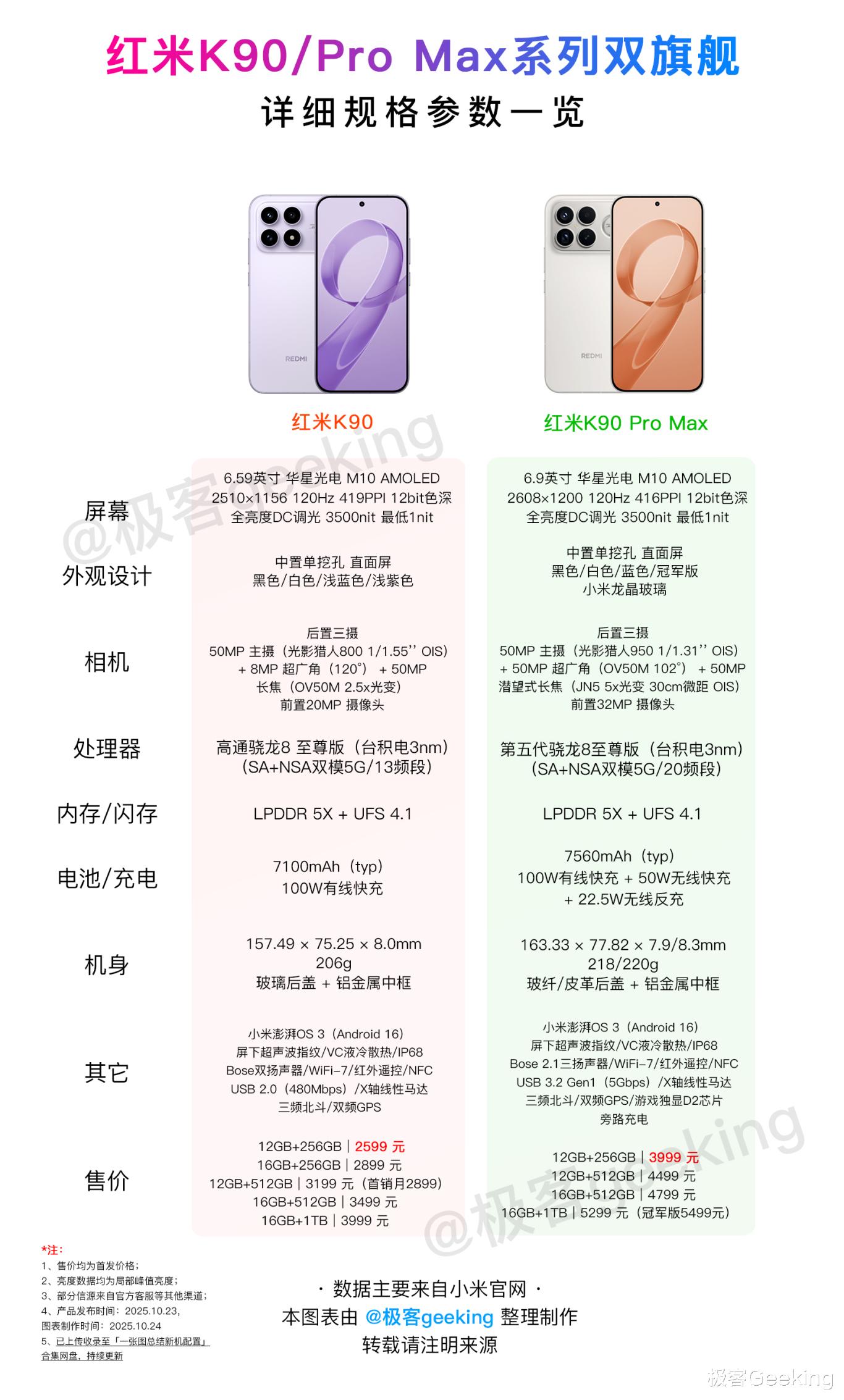 依然惯例,关于最近发布的红米K90 系列,极客君这次依然带来了「一张图总结手机配置」,这两款新一代旗舰手机的外观、详细配置参数和售价尽在这张总结图表了,数据持续维护和更新。