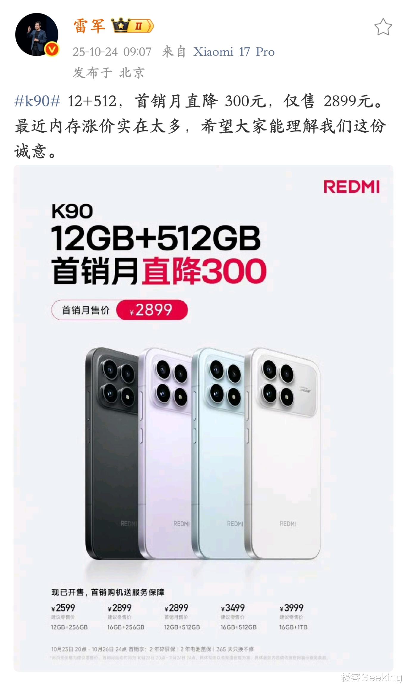同时官方表示存储供应链上游有所涨价,这也是 K90 系列新机价格变动的直接原因,小米品牌倾听用户对版本间差价质疑的声音,回应称对于用户需求量最大和呼声最高的 12GB+512GB 版本,决定首销月内直降 300 元,价格调整为 2899 元。