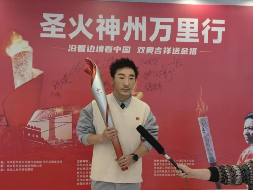 (照片:圣火神州万里行活动现场,北京市慈善义工联合会爱心100文艺服务队创始人齐航手持2022北京冬奥会火炬)