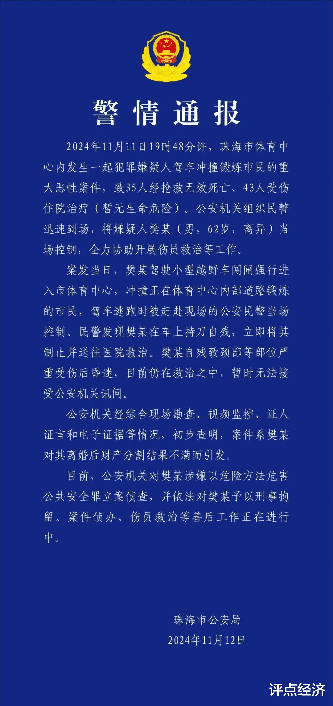 想到昨日看到珠海体育中心的驾车撞人事件,昨日还不敢相信是真的,自从号召人民群众不信谣、不传谣之后,凡不是我亲眼看见的,我一律把它当成谣言看待,绝不相信会有这样的事。但是今天真吓了一大跳,居然说是真的!死了35个人,伤了43个人!这是有多大的冤?多大的仇?我个人判断,就是社会上很多事吧,堵得太死了,连一个缝都没有。本来按照警方说的,离婚了,感觉财产分配不公,纠集几个人,把前妻或是法官打一顿,估计也能消消气,但是现在也不可能了,那就是寻衅滋事罪。那反正是罪,不如搞个大的?或者说是在这个过程中,积累了越来越多的气愤,但是都找不到一个可以随时宣泄的出口,所以才会恨意滔天。