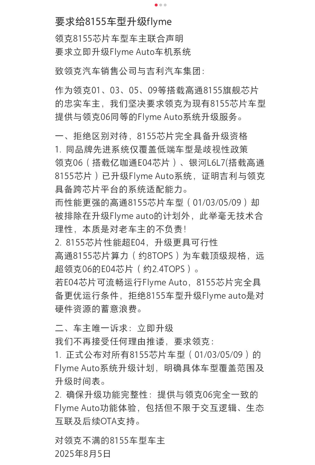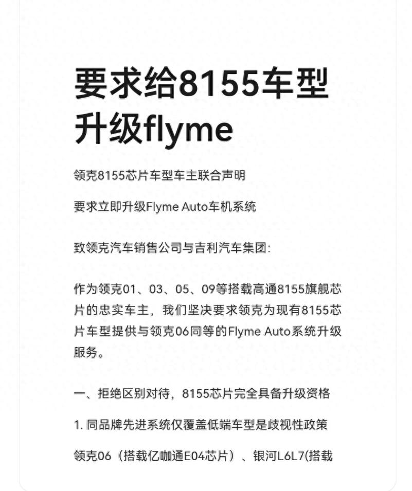 这名车主在声明中表示,作为领克01、03、05、09等搭载高通8155旗舰芯片的忠实车主,坚决要求领克为现有8155芯片车型提供与领克06同等的Flyme Auto系统升级服务。