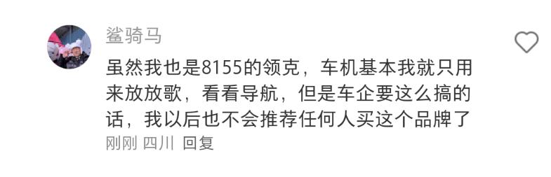 在评论区有不少网友进行了评论,有网友称虽然我也是8155的领克,车机基本我就只用来放放歌,看看导航,但是车企要这么搞的话,我以后也不会推荐任何人买这个品牌了。
