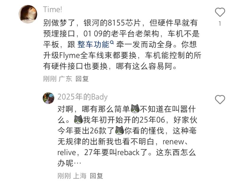 还有网友指出别做梦了,银河的8155芯片,但硬件早就有预埋接口,01 09的老平台老架构,车机不是平板,跟 整车功能 牵一发而动全身。你想升级Flyme全车线束都要换,车机能控制的所有硬件接口也要换,哪有这么容易。