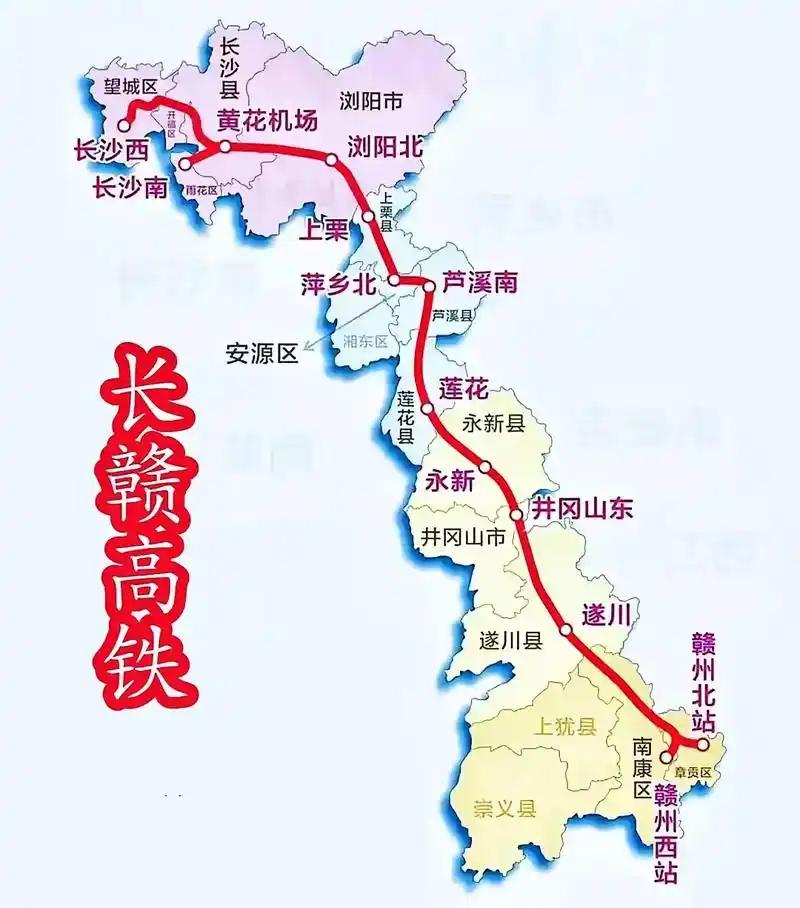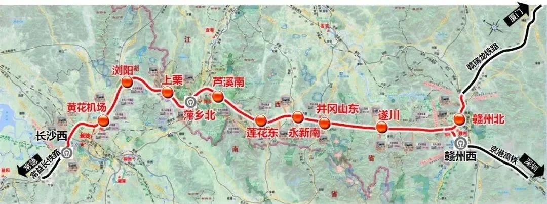 江西段全长297.573公里(占全线70%),设9站:上栗、萍乡北、芦溪南、莲花东、永新南、井冈山东、遂川、赣州北、赣州西站