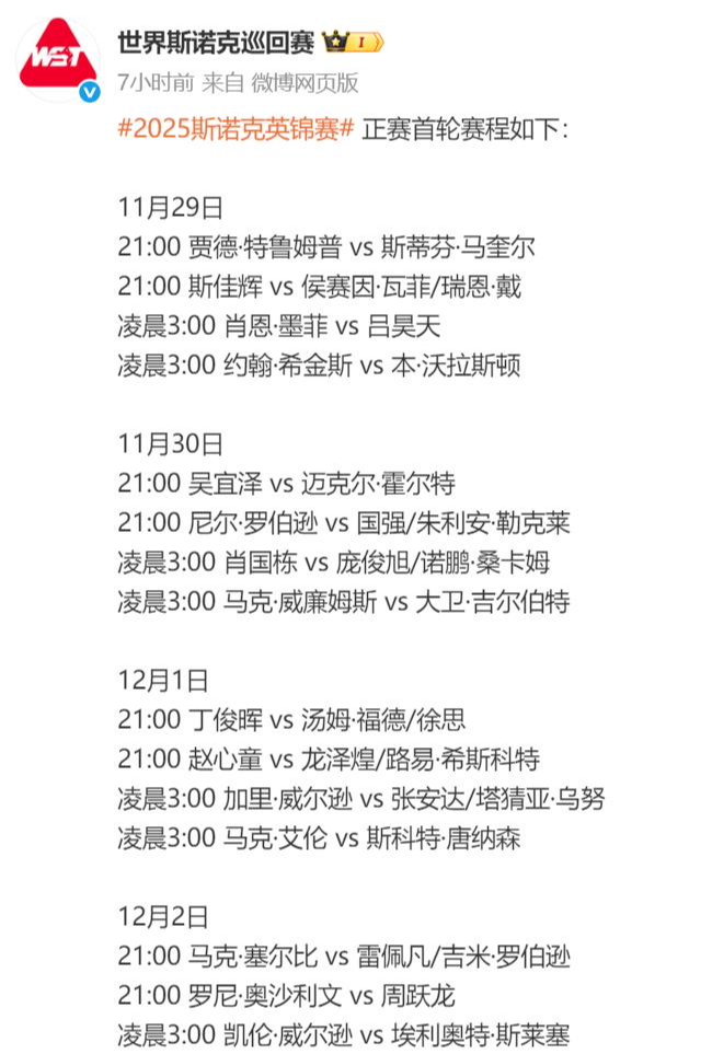 作为本次赛事的16号种子,斯佳辉将对阵瑞恩戴。这两位选手此前交手过4次,斯佳辉是4胜1负,胜率非常不错。双方最近一次交手是在2025年冠军联赛,斯佳辉3-1获胜。这次双方交手,只要能够正常发挥,斯佳辉就没有任何问题。