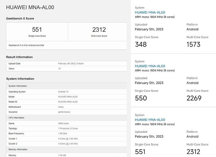 根据网间关于华为将发布信息的传闻越来越,其中包括Mate X3的折叠屏新机,主打影像旗舰的P60系列以及nova系列新机等。同时,传闻中还透露,有部分新机有望在2月底在巴塞罗那召开的MWC2023上亮相。同时,继此前网间曝光了两款型号分别为LNA-AL00和MNA-AL00的华为新机通过了入网许可后,日前,其中型号为MNA-AL00(代号蒙娜丽莎)的新机已经出现在了GeekBench5跑分平台上。