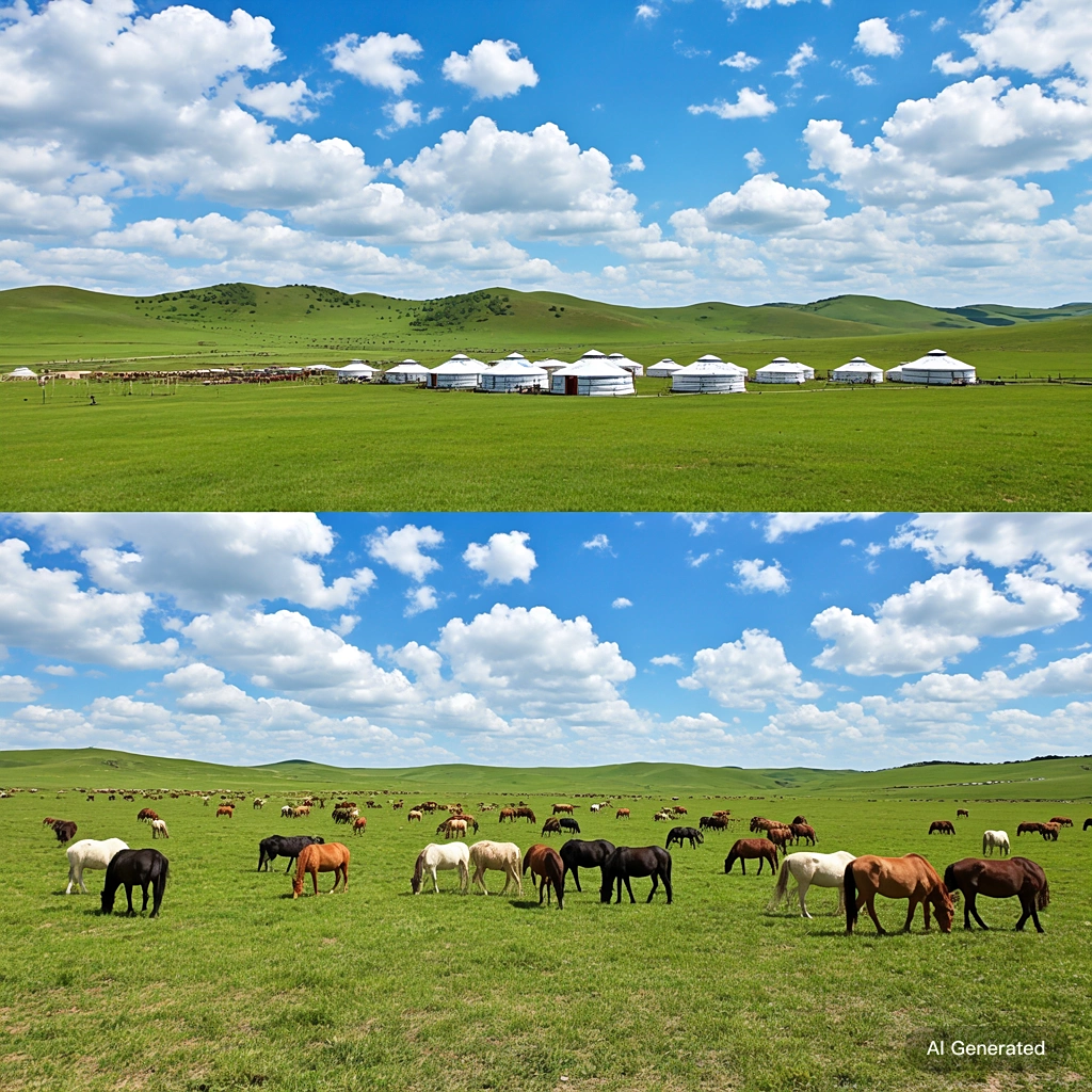 特色:一望无际的翠绿草原与蓝天相接,牛羊如珍珠散落,蒙古包点缀其间,展现最原始的草原生命力。拍照tips: