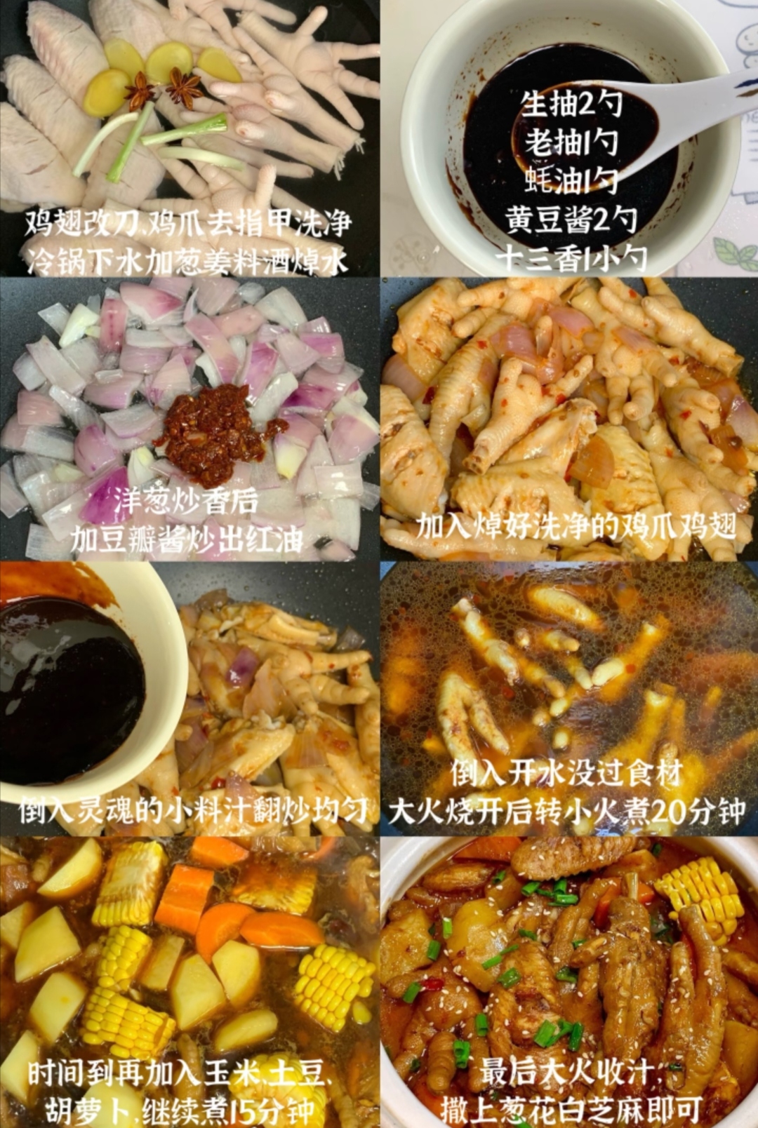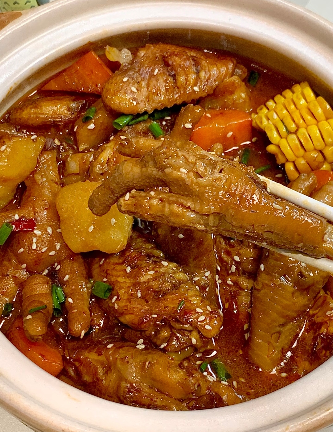 先别急着扒饭!先拎一只鸡爪,轻轻一提,骨头“咻”地滑出,只剩软糯弹牙的皮和筋,在酱汁里滚一圈送入口,胶质黏嘴唇,幸福感原地爆炸。鸡翅更绝,筷子一夹就脱骨,肉质纤维吸饱汤汁,甜咸香辣轮番轰炸味蕾。玉米段咬一口,爆汁清甜混着酱香,胡萝卜软而不烂,带着肉味,连平时挑食的小朋友都抢着吃。最后剩那点浓汤,拌米饭能吃三碗,锅底刮得比脸还干净。