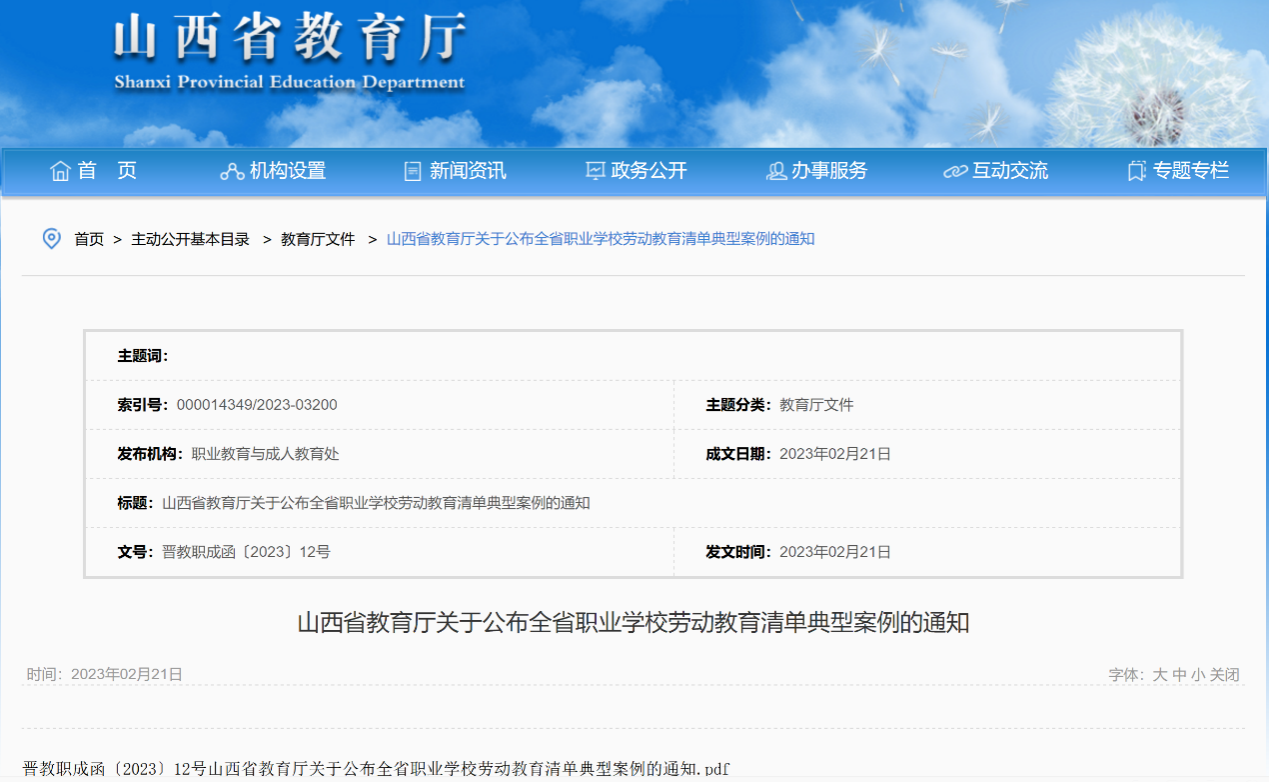 2023年2月,山西省教育厅公布了全省职业学校劳动教育清单典型案例。经各学校申报、市级推荐和专家审核,省教育厅共遴选出全省职业学校劳动教育清单典型案例50个,并纳入职业教育教学联盟平台劳动教育资源库,在省职业学校宣传推广。