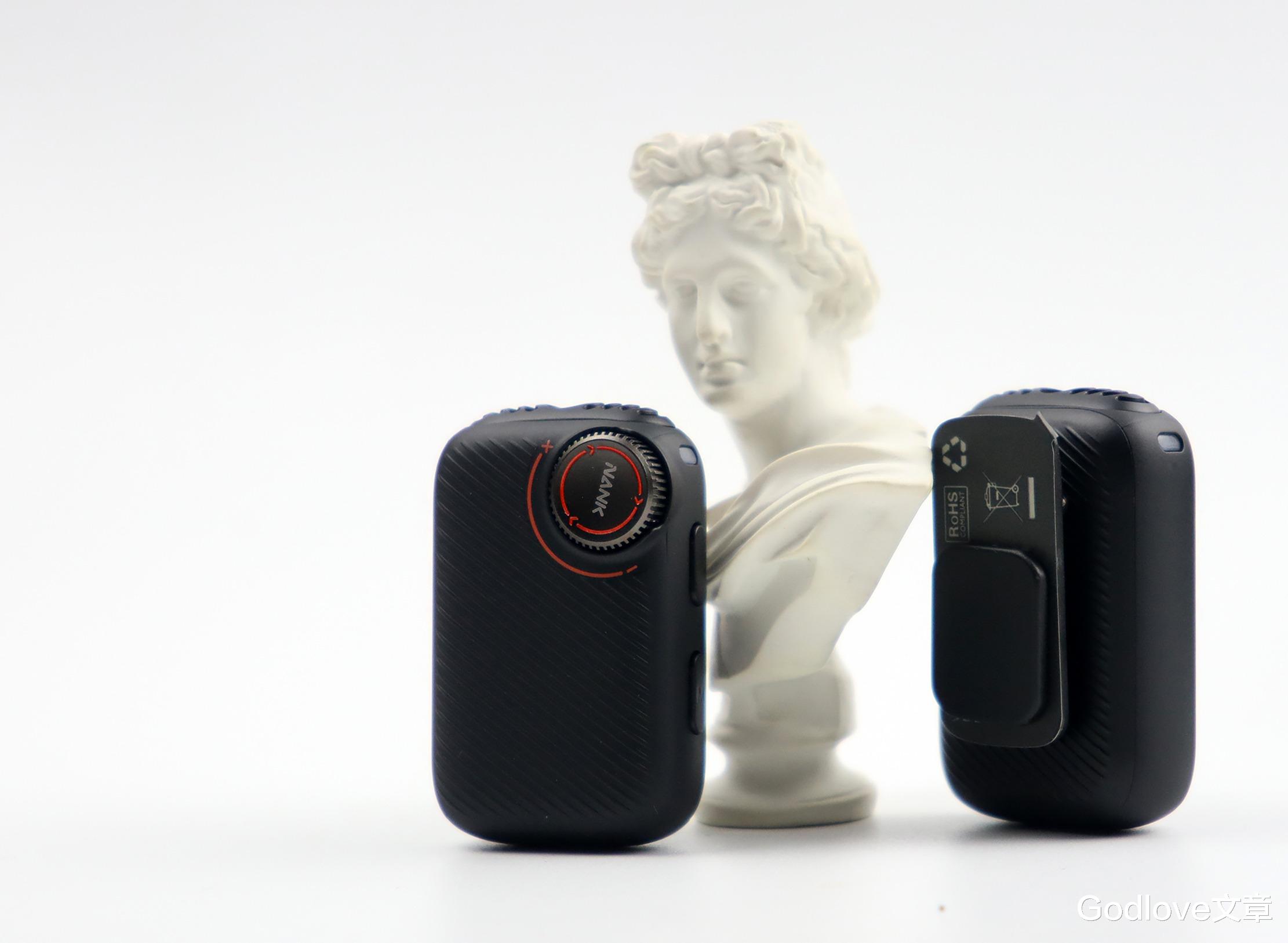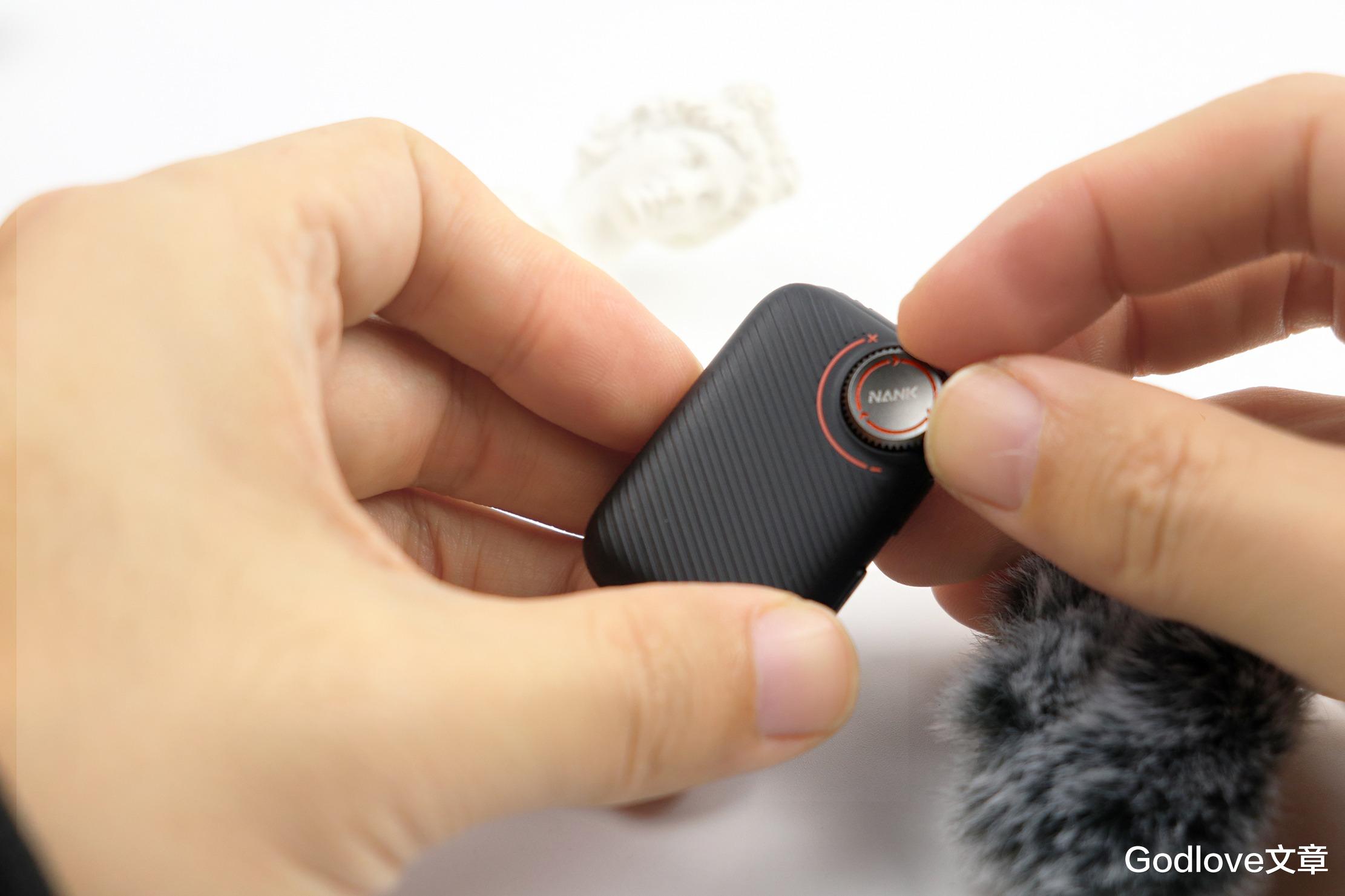 南卡 Qmic 领夹麦克风的发射器外观设计同样非常简洁和现代,整体为一个小巧的长方体,边角处理得非常圆润,没有棱角,握持和佩戴感舒适。角落有一个增益旋钮,搭配红色的装饰条,旋钮上还印有NANK的品牌logo。