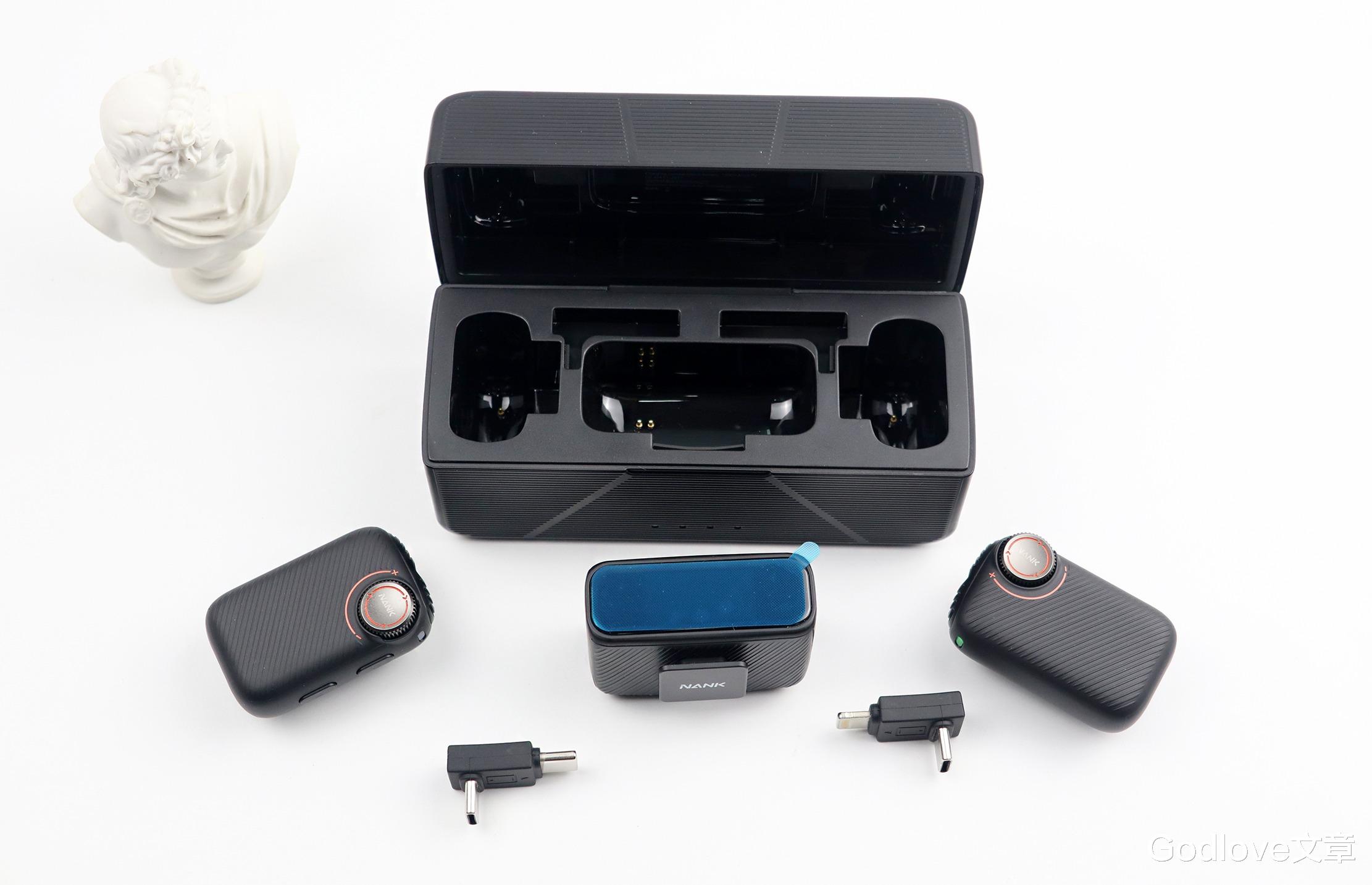 1个南卡 Qmic 领夹接收器、2个麦克风发射器、1个C-C转接头、1个C-A转接头能够很好的归置到仓内收纳,甚至还能仓内充电“续命”,唯一遗憾的是不支持麦克风带好防风毛绒罩后收纳。