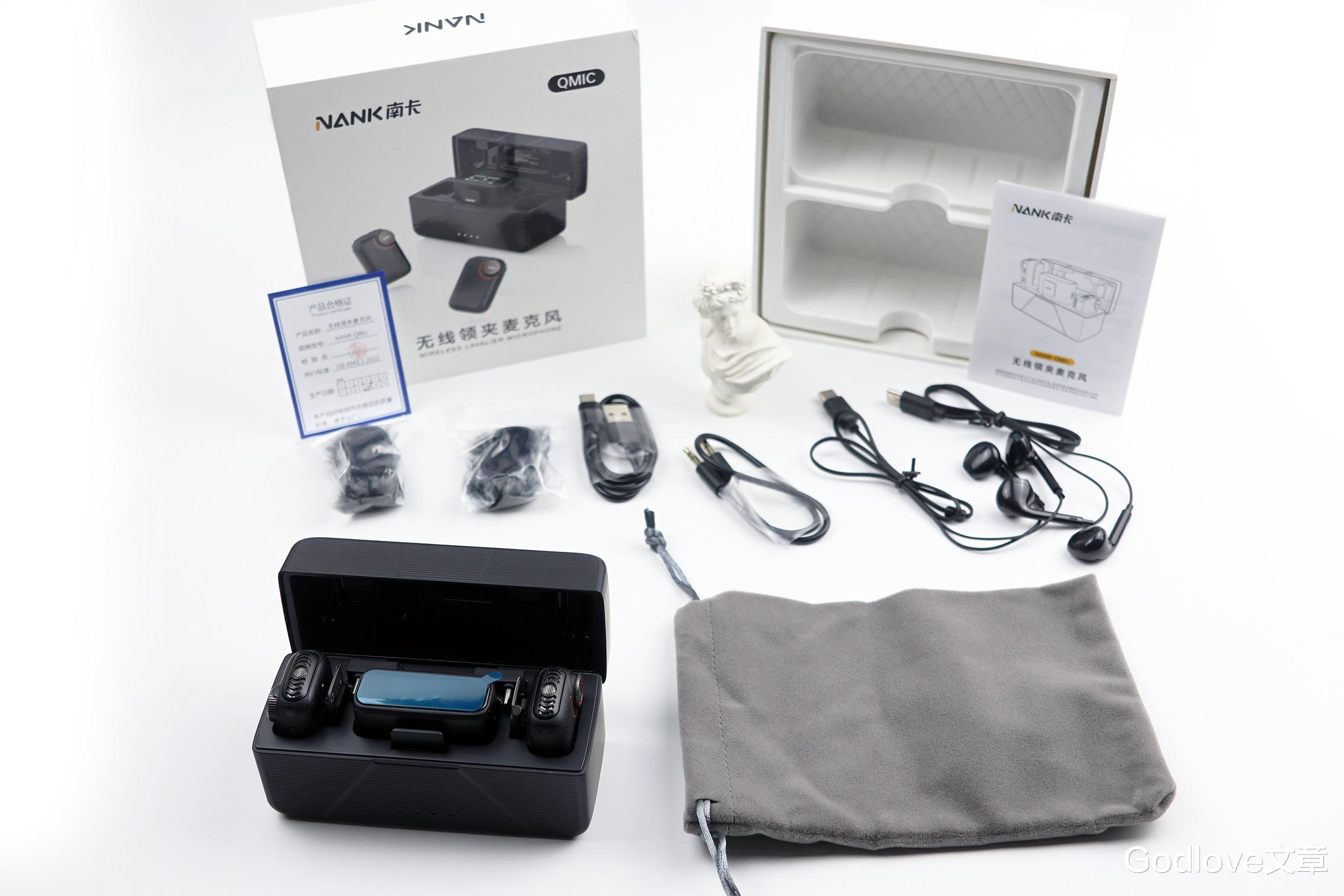 打开盒子后可以看到装箱清单包括有:充电仓(出厂状态下含有麦克风发射器和接收器)、Type-C转接头、Lightning转接头、3.5mm音频连接线、防风毛绒罩、Type-C接口监听耳机、Type-C充电线、收纳袋、说明书与合格证。