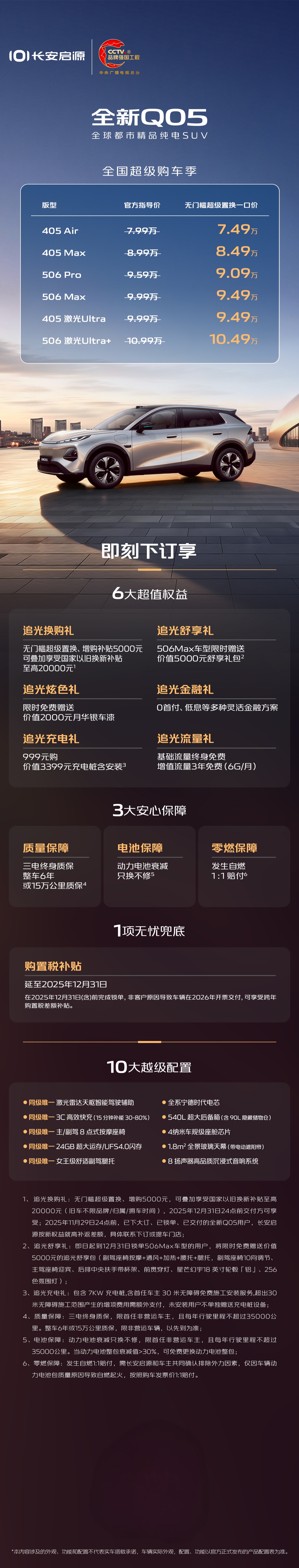 11月29日,长安启源全新Q05开启“超级购车季”,并宣布全面刷新用户购车权益,涵盖整车及三电系统的“三大安心保障”、购置税兜底政策延续至12月31日。同时,重磅推出全系无门槛超级置换、增购一口价,立省5000元,低至7.49万元起,并承诺对11月29日24点前“已下大订、已锁单,已交付”的用户,按照超级购车季新权益就高补返差额。