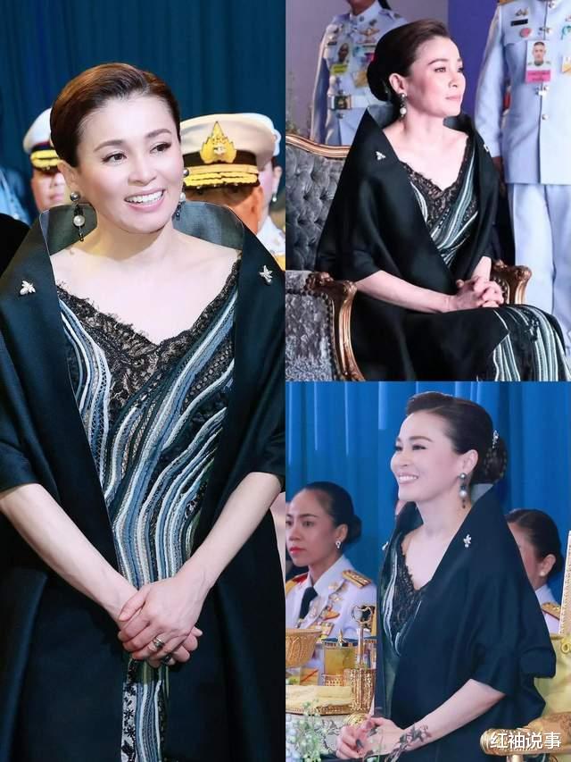 当下正值国丧期,苏提达王后出席活动时着装十分应景。她身着一袭黑色现代晚礼服,其上白色条纹巧妙点缀。搭配的黑色披肩尽显雍容华贵,堪称点睛之笔。黑色鱼尾裙随着步伐摇曳,V领口的蕾丝装饰,更是将她的曼妙身材完美凸显。