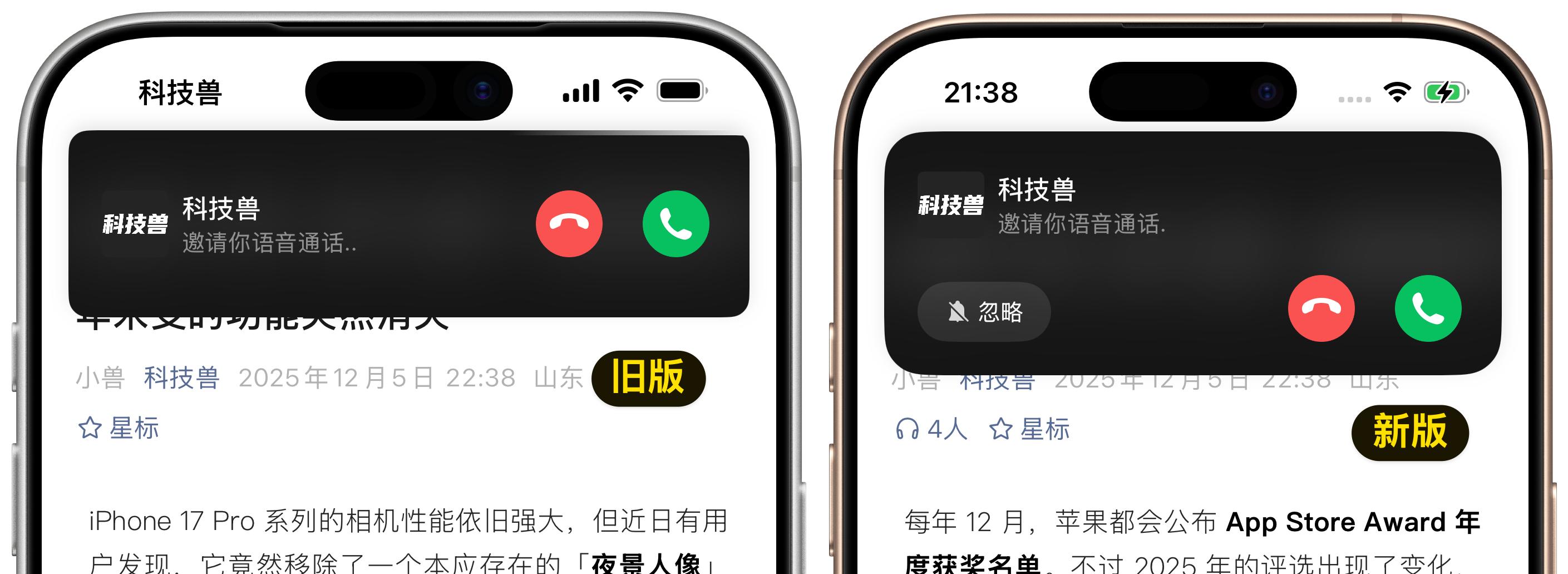 来电弹窗样式升级,新增「忽略」按钮 首先是在使用微信时,微信内的语音和视频来电弹窗样式更新。新的设计弹窗整体面积更大,边角也更加圆润。同时弹窗左下角新增了一个「忽略」按钮。