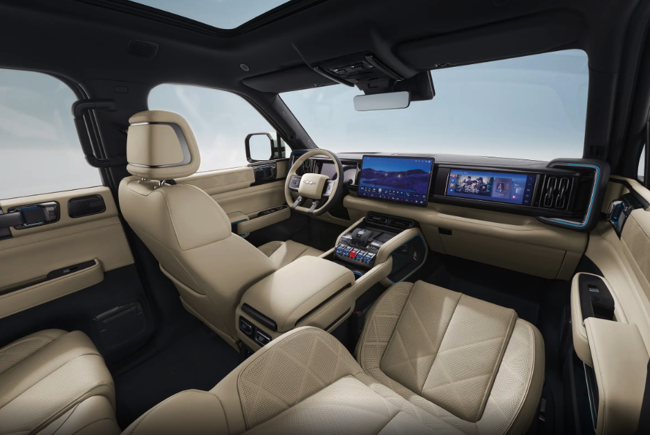 动力方面照样硬核,1.5T 插混系统能爆发出 505kW 功率,零百加速 4.8 秒,红绿灯起步绝对有推背感。关键是越野能力还升级了,新的 DMO + 平台带 “全速域路面感知控制”,不管是沙地、泥地还是炮弹坑,车子能自己调节每个车轮的扭矩,就算是越野新手也能轻松过障碍。更惊喜的是,以前顶配才有的云辇 - P 悬架现在给配上了,悬架能调 140 毫米高度,离地间隙最高 310 毫米,交叉轴、25-42° 斜坡都不在话下。