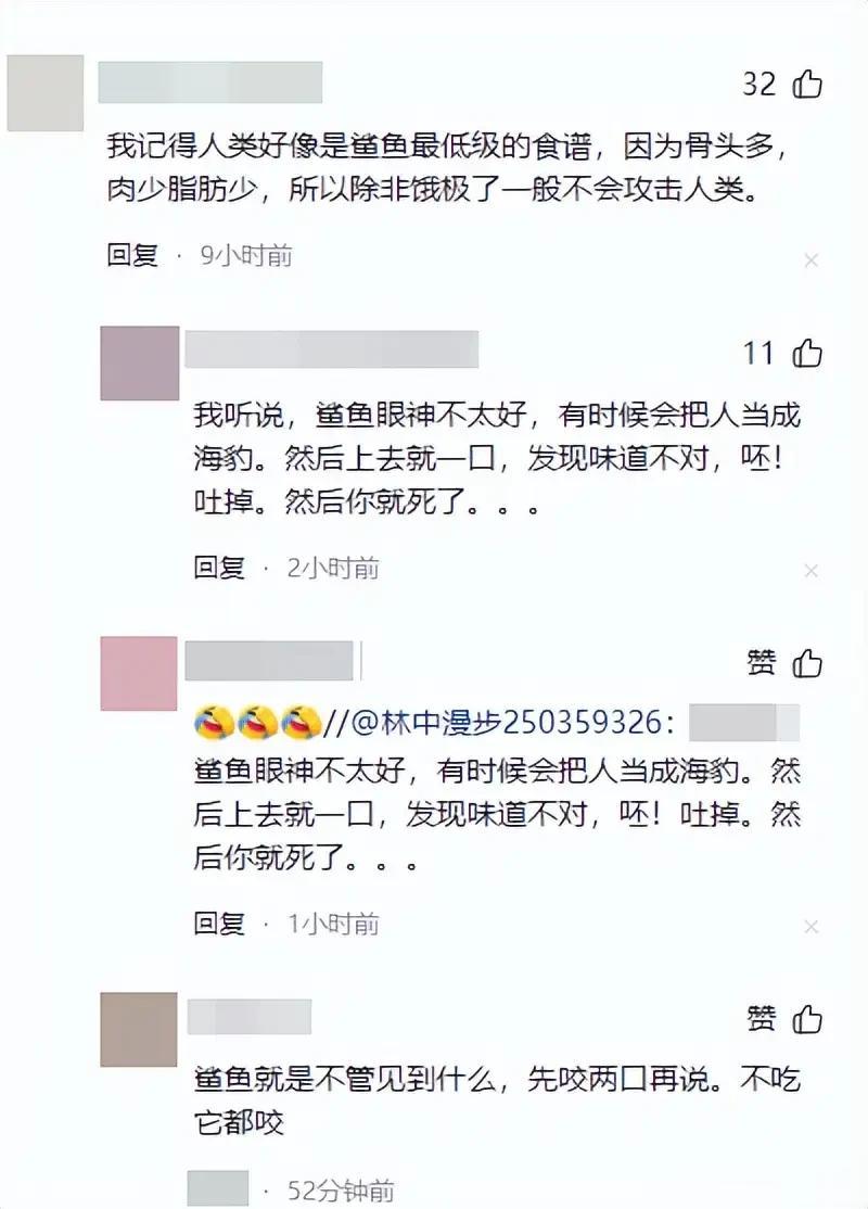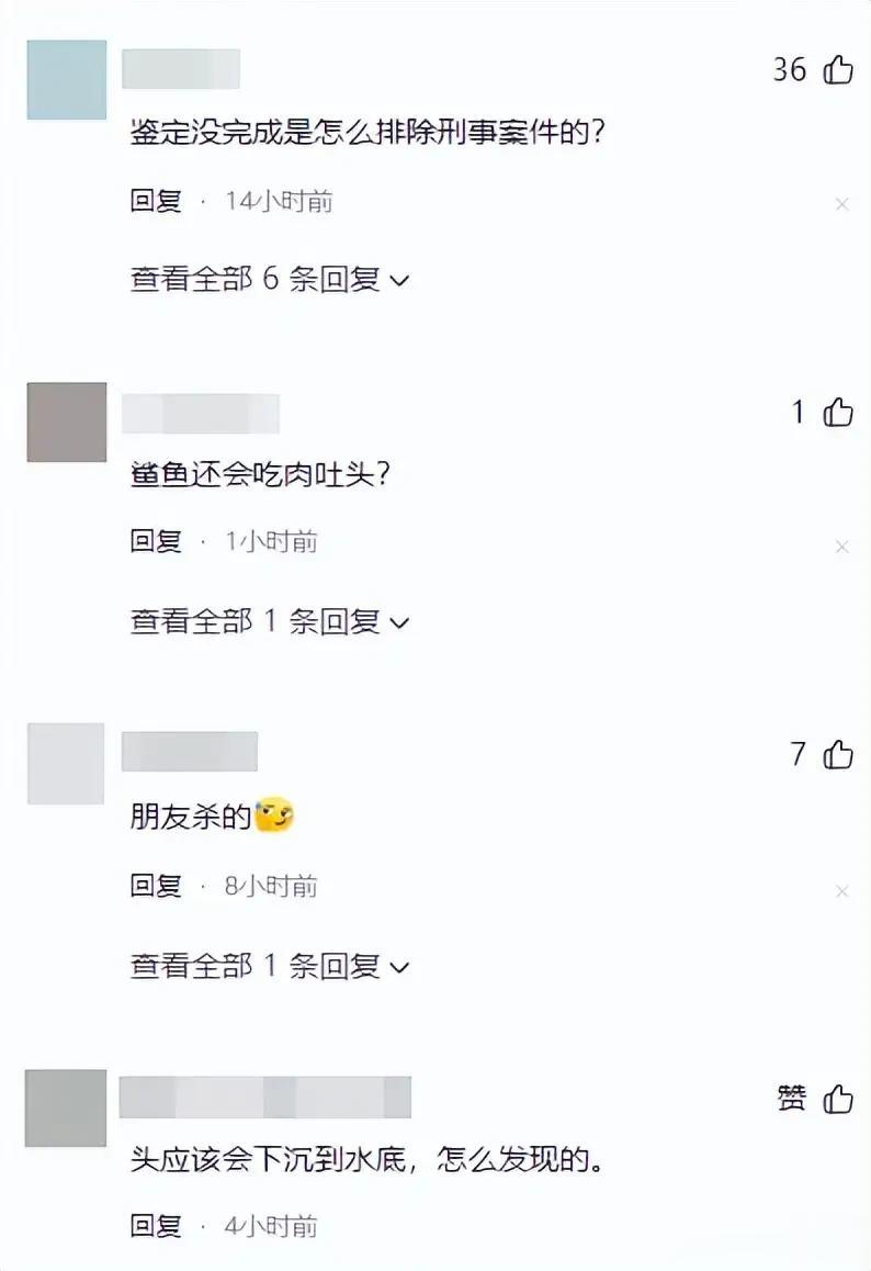 其次是“鲨鱼袭击的不合理性”。网友们普遍指出,人类骨头多、脂肪少,并非鲨鱼的理想食物,通常鲨鱼误咬后会因口感不佳吐掉,极少出现“只啃食身体、单独留下头颅”的情况,这种选择性进食的痕迹,实在不符合鲨鱼的捕食习性。