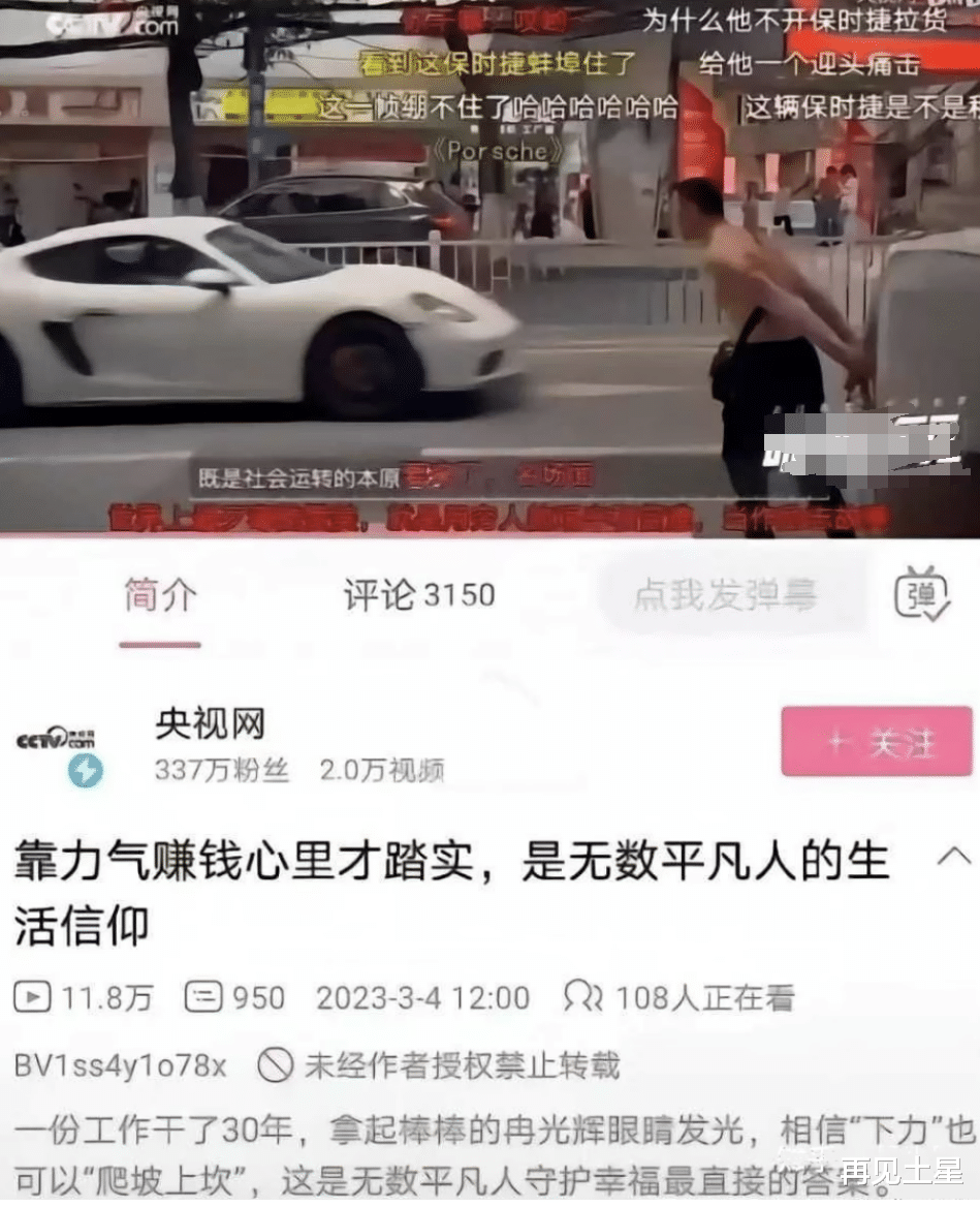 这个视频文案:一份工作干了30年,拿起棒棒的冉光辉眼睛发光,相信“下力”也可以“爬坡上坎”,这是无数平凡人守护幸福最直接的答案。不难看出,记者很赞赏这种身体力行,脚踏实地的精神,也希望这种精神发扬光大,相信下力就可以爬坡上坎,这是成长运行的逻辑,于是发出这一则弘扬正能量的视频激励生活无数个“冉光辉”。同时这也是一则表达只要努力都能收获幸福的视频逻辑。然而,这次央视“翻车”了,视频一发出,有网友看到这位大叔拉车的画面和对面驶出来的保时捷跑车形成鲜明对比,一下子就戳到网友的敏感点,引发不满和争议,最终视频不得已重新处理。
