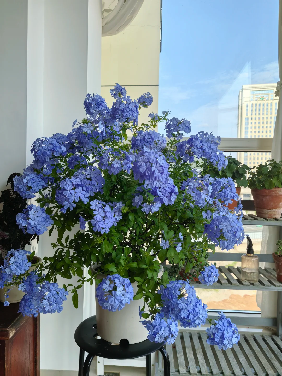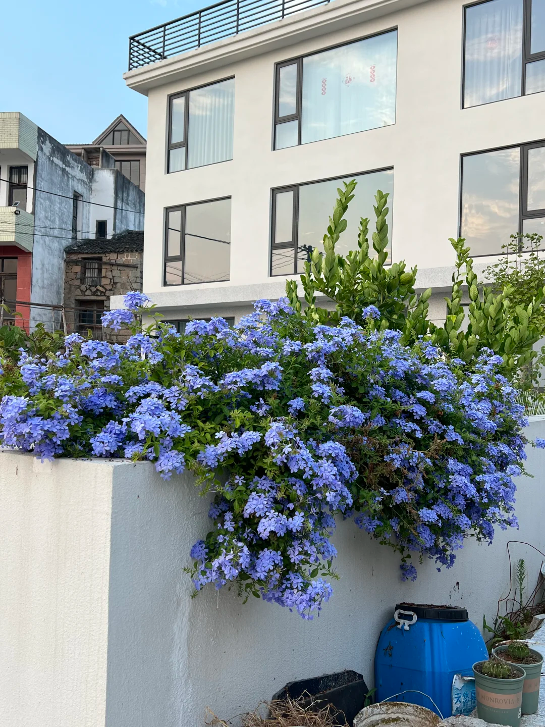 蓝雪花生命力旺盛,堪比野草,养护简单,而且开出的花色是清凉的蓝色,可以从5月份一直持续到12月份左右。