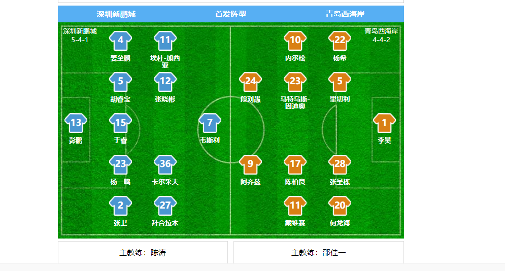 邵佳一执教青岛西海岸期间,主要使用的阵型有两个,分别是防守端的4-4-2以及进攻时的2-3-2-3。