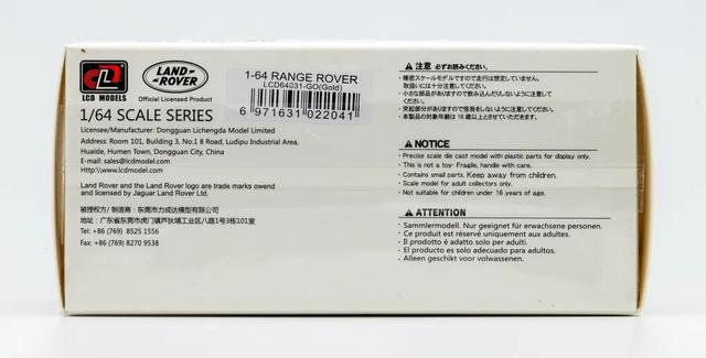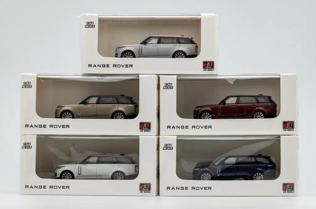 模型的包装非常“LCD”,白色开口纸盒,亚克力有机罩子,塑料底座,金属铭牌,这些都是100出头产品的日常了,但也过于老套了;纸盒背面有醒目的RANGE ROVER(揽胜)标志,侧面有车型线条图,底部有路虎的授权,还有一张质保卡;LCD的这款新揽胜一共推出了5个色,这次笔者也尝试壕了一把,刷了个全套,这5个色分别是金色、白色(金色顶)、红色(黑的顶)、蓝色以及银色(金色顶),相对来说双色版本更耐看,特别是白色和银色两款。