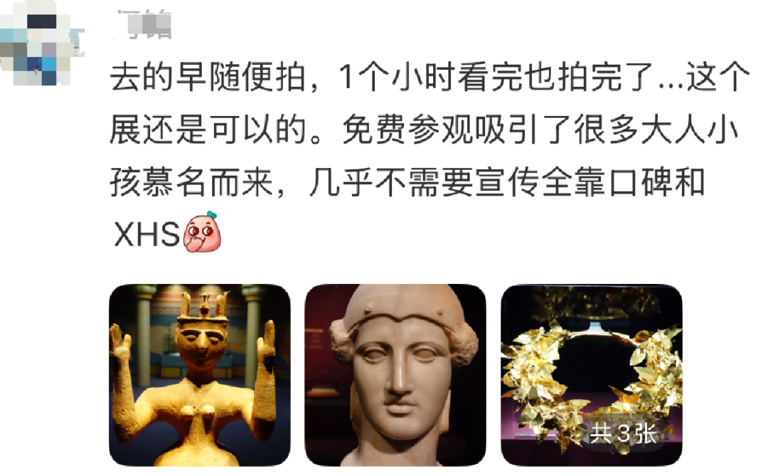 从观众反馈来看,这场展览的 “震撼感” 贯穿全程。最绝的当属阿伽门农黄金面具(复制品)与三星堆金面具的 “隔空相望”——两件承载着不同文明核心记忆的金器,隔着时空仿佛完成了一场无声对话,让人瞬间起了鸡皮疙瘩!果真沉默就是呐喊!