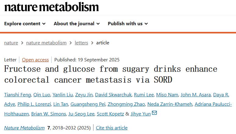 《自然代谢》上发表的一项研究指出,含糖饮料里的果糖、葡萄糖会显著增加结直肠癌的转移风险。研究人员模拟给结直肠癌小鼠喂食葡萄糖以及果糖的糖水,观察肿瘤是否有变大。