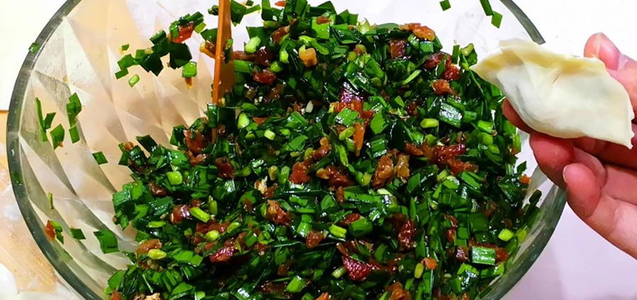 用晒干的蛏子泡软,切成小丁,再与猪肉、韭菜混合,加入适量调料拌匀。