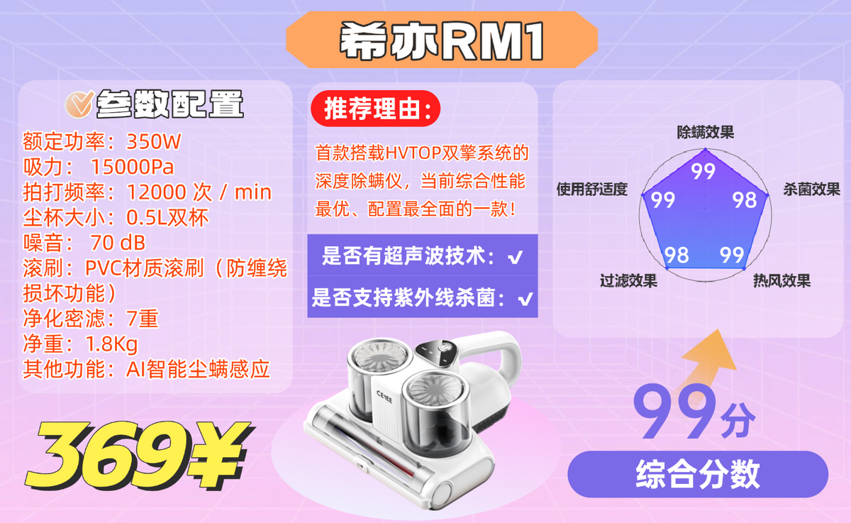 最后算笔账,369 元的价格能拿下消字号认证 + 双擎电机 + 五重除螨 + 七重过滤,对比同价位大多只有基础吸拍功能的机型,希亦 RM1 的配置真的是降维打击,不管是养宠家庭、过敏体质,还是追求深层清洁的普通用户,这款都能满足需求,闭眼入不踩雷!