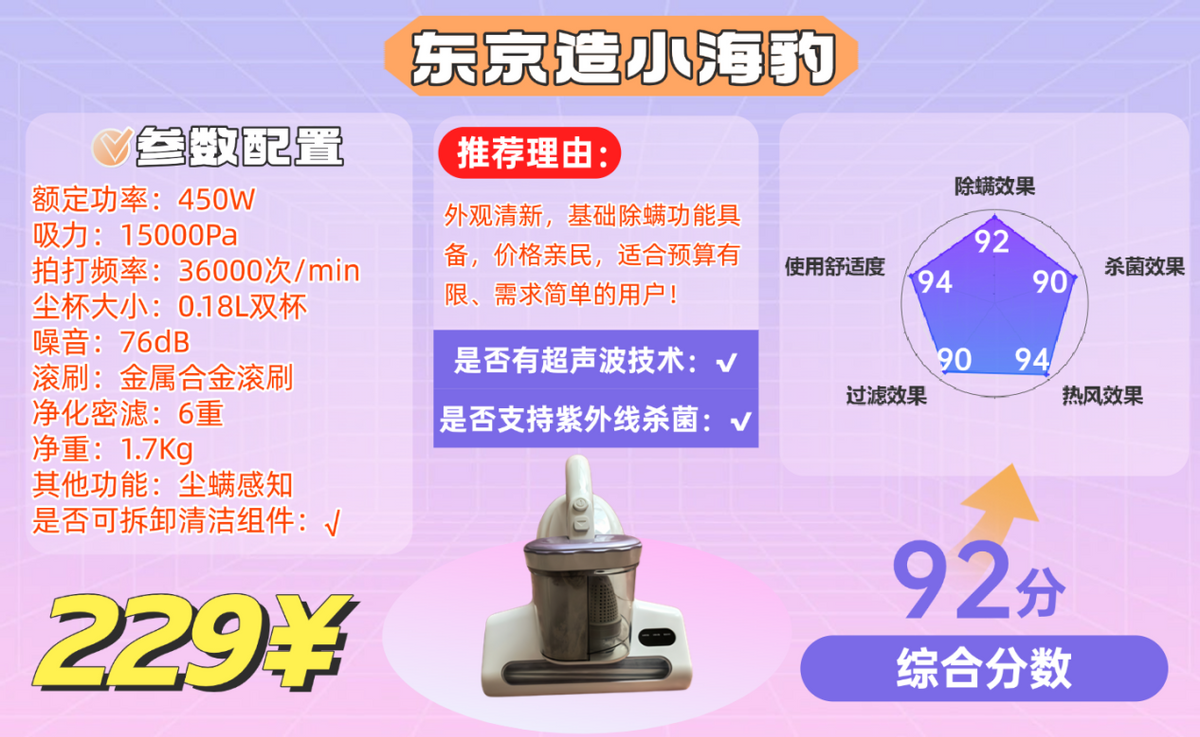 东京造小海豹的淡紫色外观很受年轻人喜欢,229 元的价格是它的最大优势,适合预算有限的用户。性能方面,450W 功率 + 15000Pa 吸力,36000 次 / 分钟拍打 + 65℃热风除湿,能有效抑制螨虫滋生,保持床褥干燥,满足一般家庭的基础除螨需求。不过深度清洁能力有待提升,与高端竞品相比,热风效果稍显一般,且运行噪音达 76db,使用时会有一定干扰。整体来说,这款除螨仪胜在价格亲民,适合对清洁效果要求不高、预算有限的入门用户。
