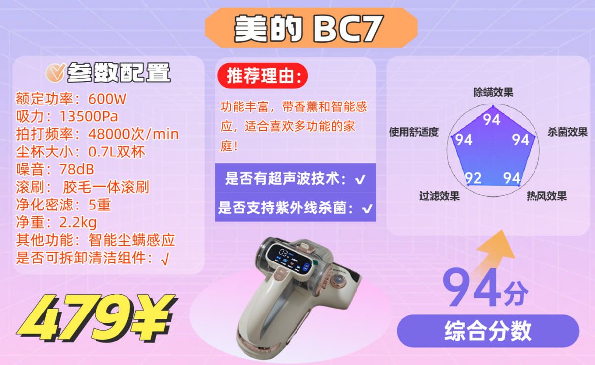 综合描述:必胜这款除螨仪的淡紫色外观真的很圈粉,1.4kg 超轻机身,女生手持操作毫无压力,宿舍、卧室、车内等场景都能灵活使用,收纳也不占空间。性能方面,每分钟 60000 次强拍频率 + UV 紫外线照射,满足日常基础除螨需求没问题。无线充电设计很便捷,普通模式下续航约 40 分钟,但强力模式下仅能续航 20 分钟,大户型整套房间清洁完全不够用,更适合局部清洁。499 元的价格在同价位中竞争力不强,性能表现中规中矩,更适合看重颜值和便携性、清洁需求不高的小户型用户。