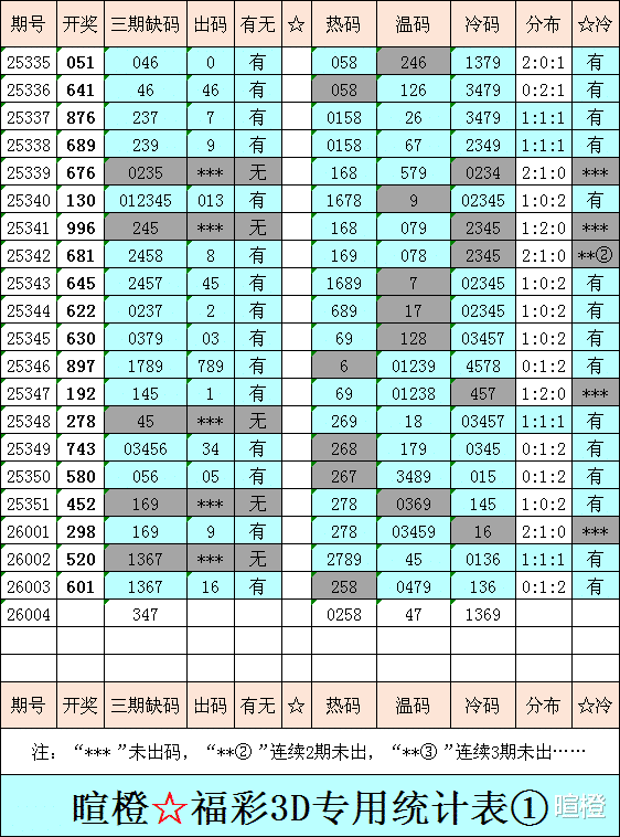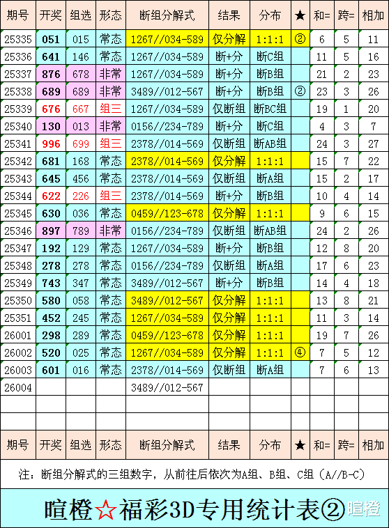 26004期:暄橙福彩3D综合条件(本期将在1月4日21:15开)一、上期回顾 ☆1、上期开奖号:6 0 1。2、和值= 7,跨度= 6。3、常态组六,001路组合。4、热度分布(热:温:冷)0:1:2。二、本期条件 ☆1、三期缺码:347。2、热:0258,温:47,冷:1369。3、断组分解式:3489//012-567。4、四胆:5679;三胆:579。三、术语解释 ☆1、三期缺码:0至9这十个自然数当中,未在近三期开奖号出现的数字。2、热度(热温冷):自然数0至9,在近七期开奖号中,出现3次及3次以上的数字,称为热码;出现2次的数字,称为温码;出现1次和未出现的数字,称为冷码。某个数字在开奖号中出现几个,就按几次计算。3、断组分解式:将0至9这十个自然数,分成三组数字,从前往后依次为A组(4码)、B组(3码)、C组(3码),一般情况下,有一组数字不出码,偶尔会有两组数字不出码。A组不出码的情况相对较少。断组为主,分解为辅。4、常态组六号码:同时包含大数、小数、奇数、偶数、质数、合数的组六号码,共有72注。统计表中,简称“常态”。5、非常态组六号码:全大数、全小数、全奇数、全偶数、全质数、全合数等六种形态的组六号码,共有48注。统计表中,简称“非常”。★提醒:彩市有风险,参与须谨慎!理性购彩,量力而行!多看少买,不要痴迷!任何条件都有出错的时候!水平有限,仅供参考!友好互动,好运相伴!