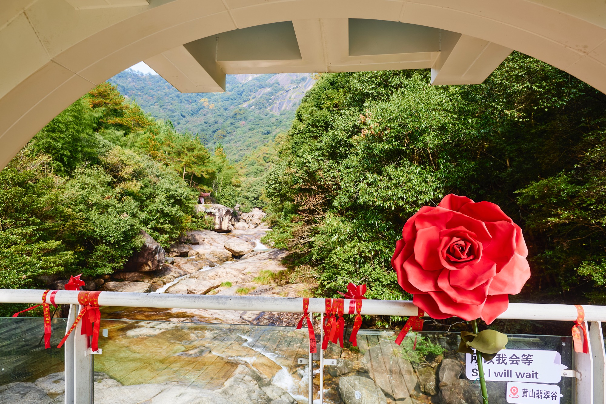 除了“人间仙境”的美誉,翡翠谷还被称作“情人谷”,景区中设置了许多爱情主题装饰——玫瑰花、桃心、写着“情人谷”的红灯笼,搭配上的秋日风光,层林尽染,溪水澄净,处处给人浪漫诗意的感觉。